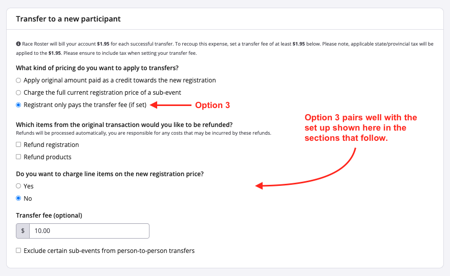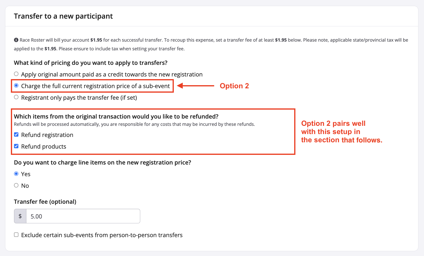 You may check off "Refund registration" and/or "Refund products" or, alternatively, leave both unchecked. Most event organizers choose to check off (i.e., refund), as OPTION 2 aims to charge full price to the new participant, so in most cases it makes sense for the original participant to be refunded. However, depending on your exact policies, there may be circumstances where the transfer is charged full price without refunding anything to the original participant (e.g. 1, you have a no-refund policy even when locating someone new to "buy a bib"; e.g. 2, you intend to refund the original participant only partially and/or outside of Race Roster).