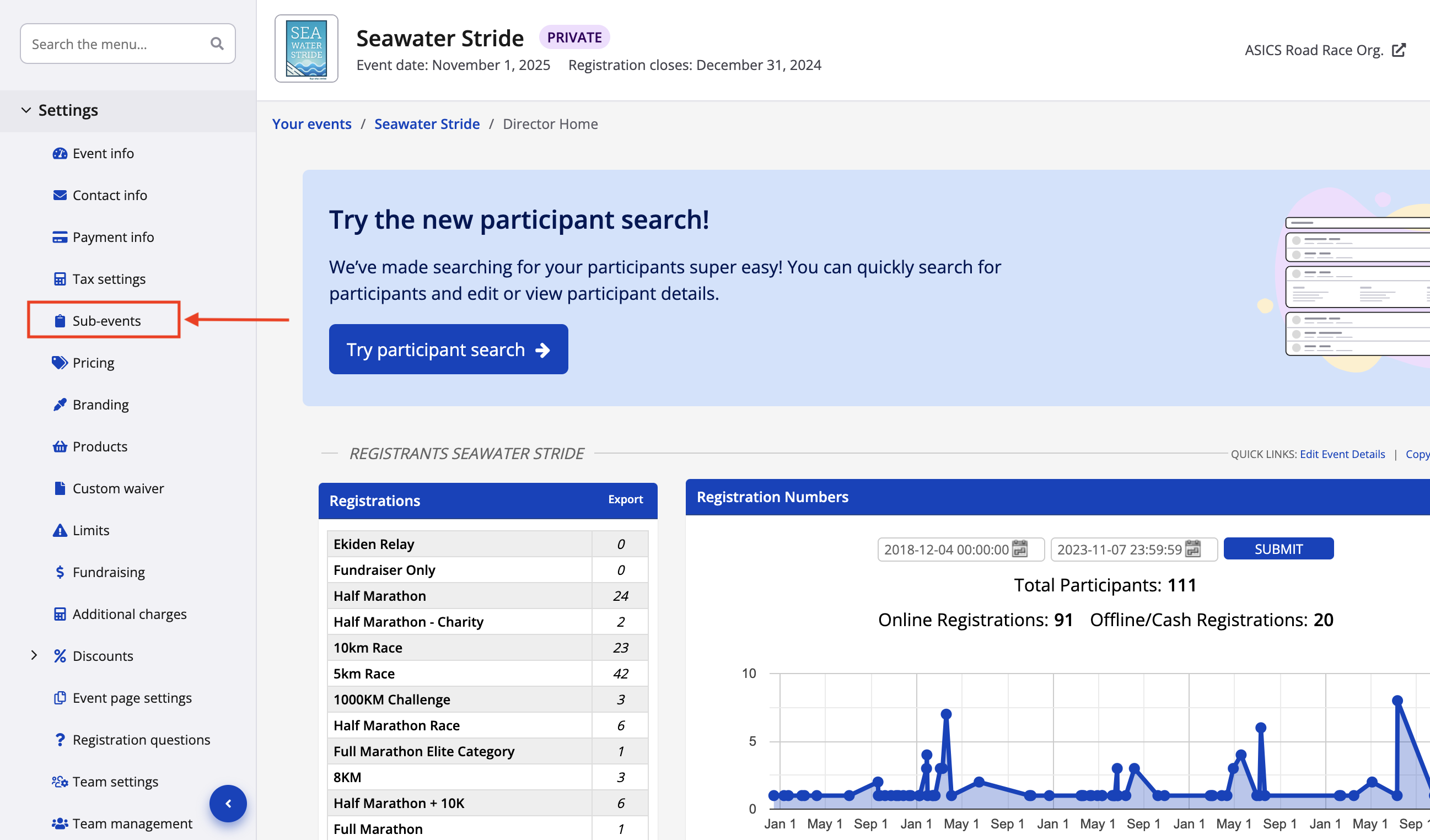 The sub-event is the building block of participant data. Specific products, registration questions, team categories, start groups, fundraising permissions, waivers, discounts and other features can be configured on a per-sub-event basis. Creating sub-events is one of the seven required steps to take an event page live. Without at least one sub-event, participants cannot complete registrations on your event page.