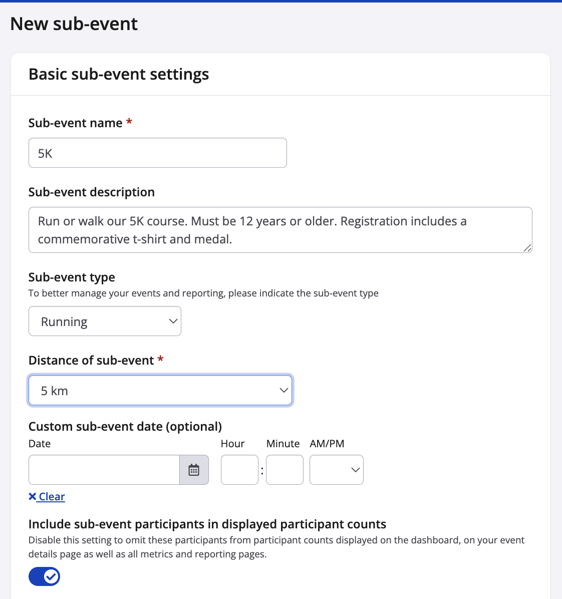 • Custom sub-event date (optional) - This appears in the confirmation email and link. Insert a custom sub-event date if the sub-event has a separate date from that within the event info settings, or if yours is a multi-date event and want to specify when this distance/sport will take place.