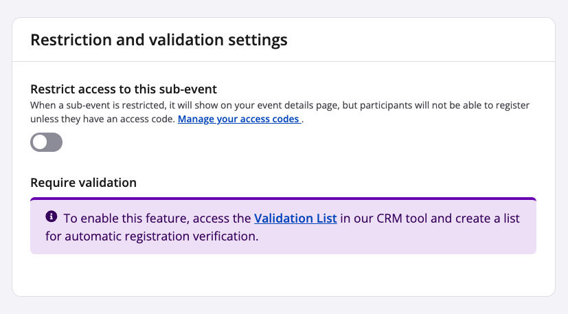 • Restrict access to this sub-event: When enabled, this toggle locks the sub-event from the general public. In order to register, the use of an access code is required. An access code may be distributed to a select person or group of people.
