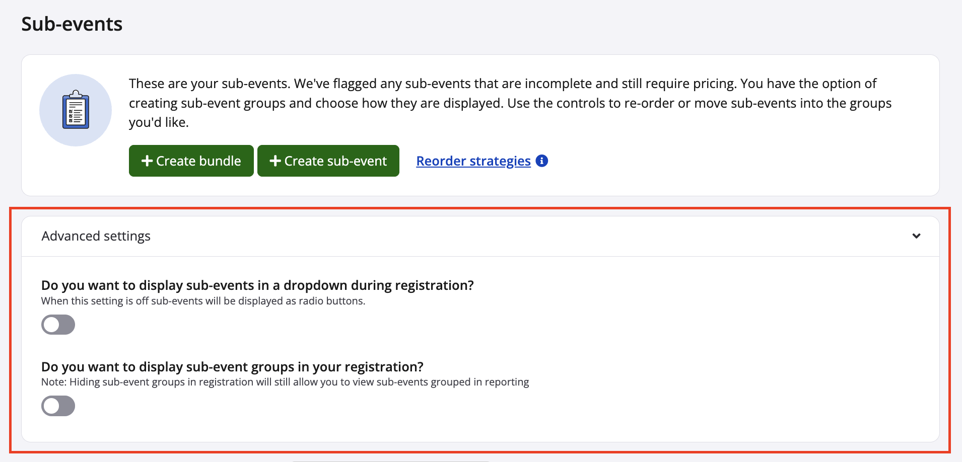 8. Back at the main sub-event settings page, notice the two advanced settings toggles (screenshot follows).