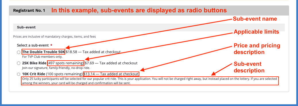 • toggle off: sub-events are displayed as radio buttons; the sub-event name and (if applicable) limits, price and pricing description will be on one line; its corresponding sub-event description (if any) displays as the next paragraph