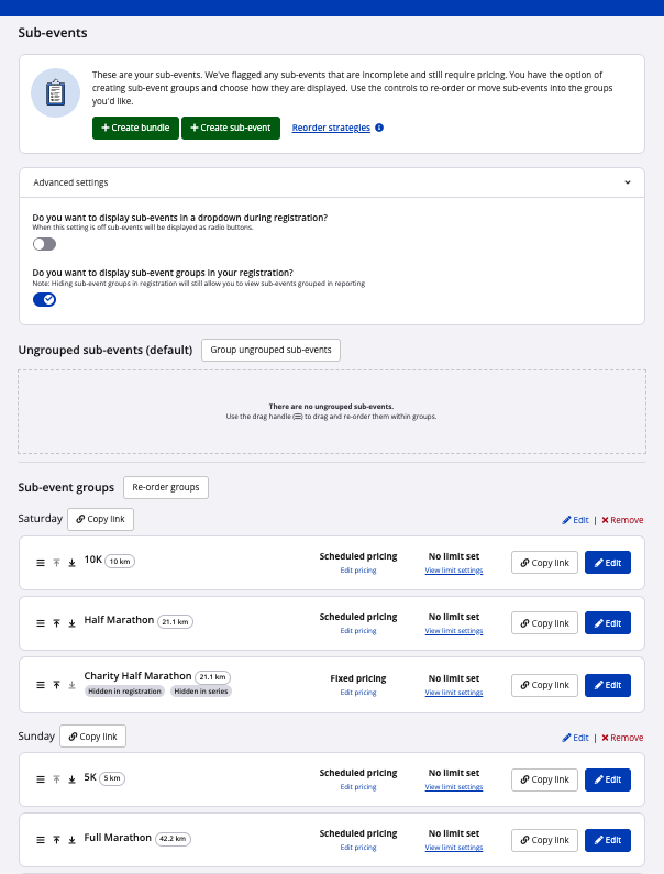 9. Whenever you visit the sub-event settings page, you will see all toggles, sub-events (with their respective Smart Links , pricing strategies , and limits ), sub-event groups, and the like displaying accordingly. Screenshot follows: