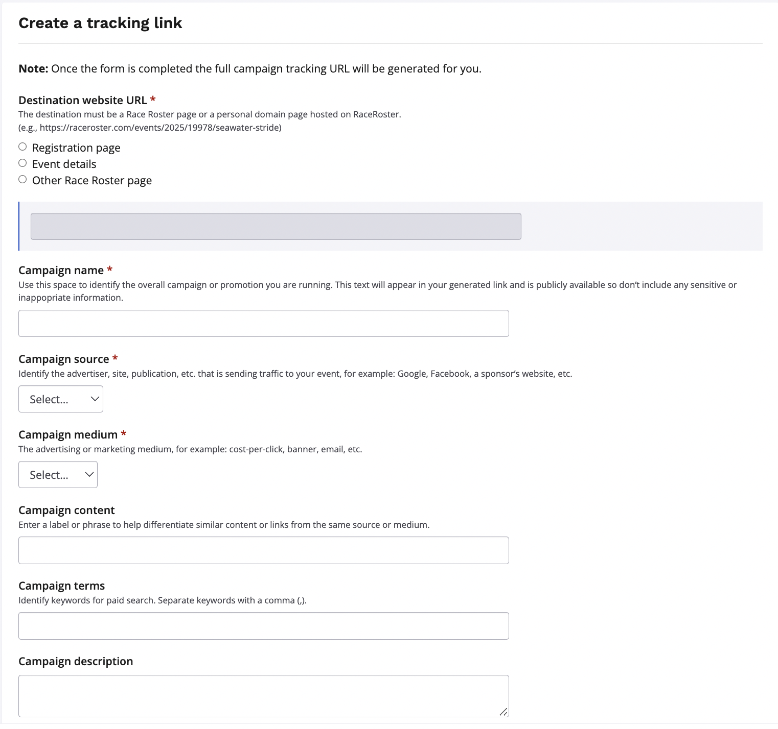 Destination website URL: The destination must be a Race Roster page or a personal domain page hosted on Race Roster.