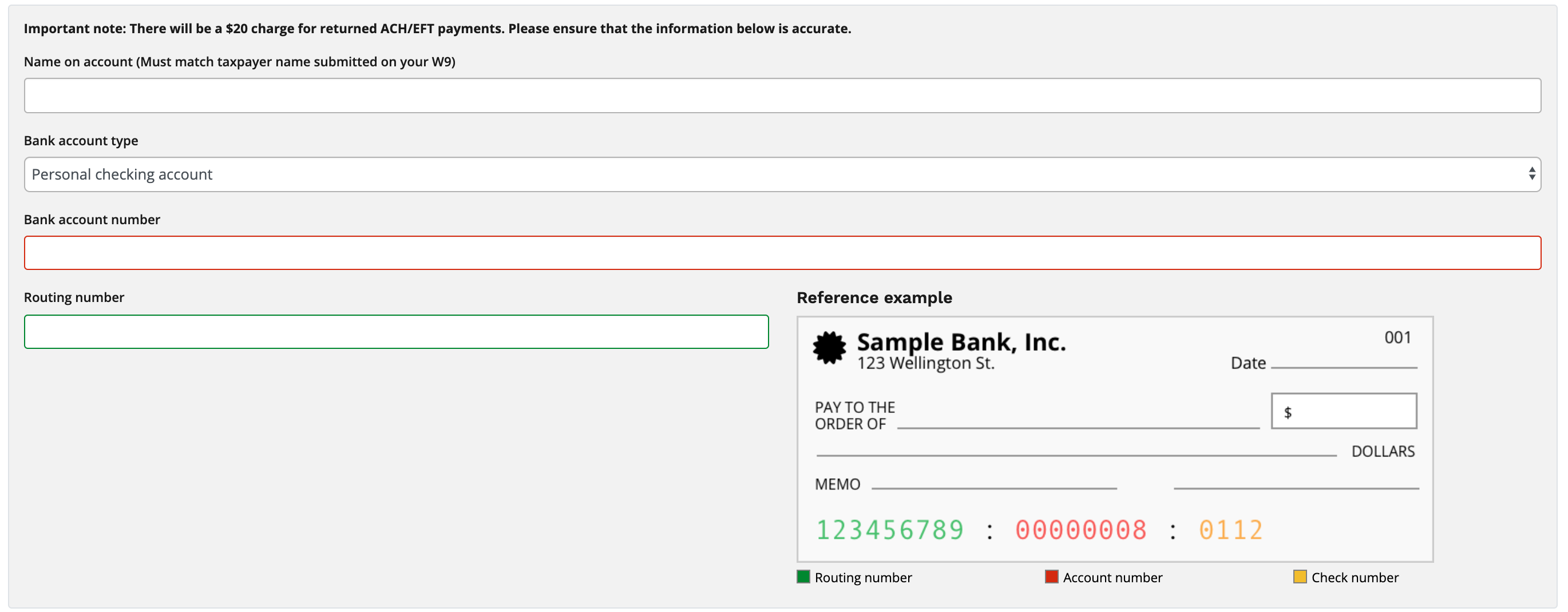 5. After selecting the USD personal profile, you will be prompted to create a Payment Profile. Please fill out any field with a red asterisk beside it. You have the option to select check or direct deposit as your payment method.