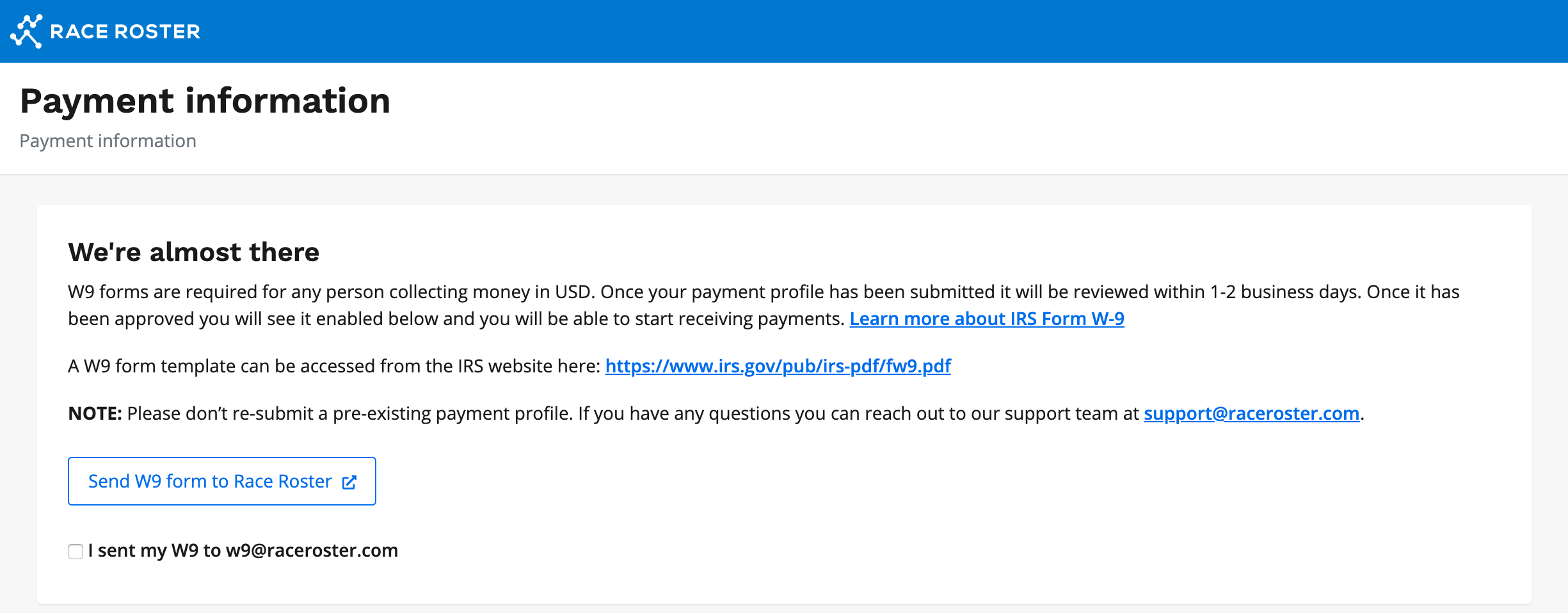 8. Once you have completed filling out your W9 form check off the box that you have sent the W9 to w9@raceroster.com and click Save & exit.