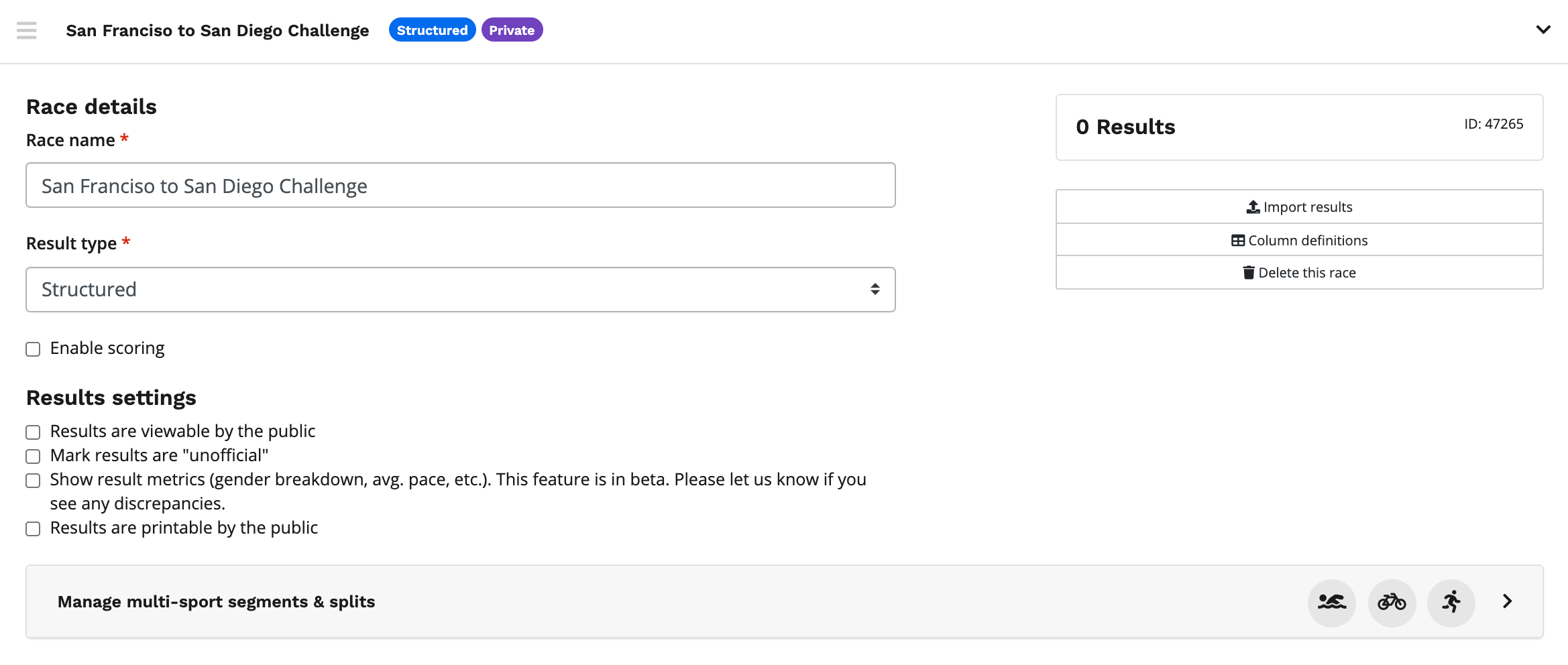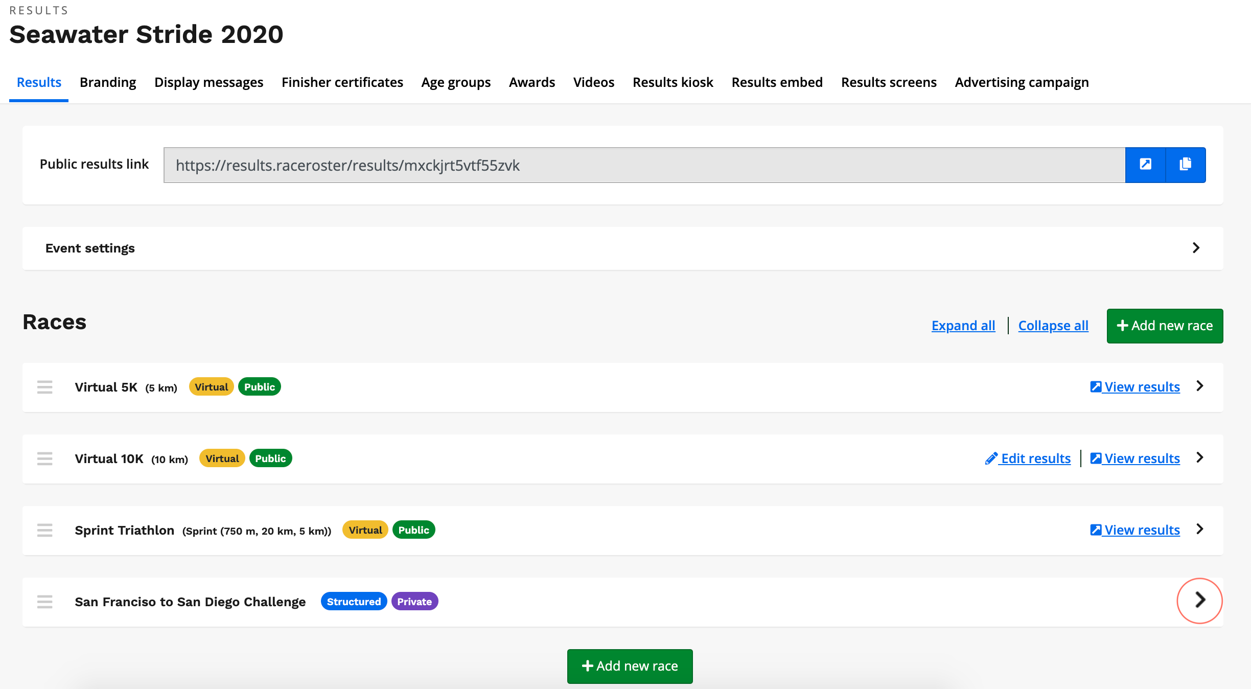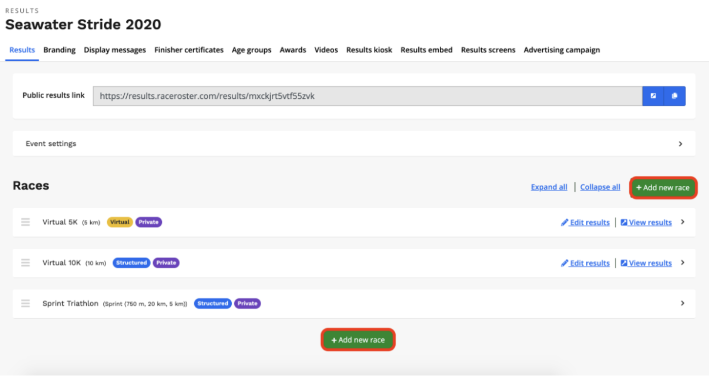 3. To create a new race within your results platform, click the green + Add a race button at the top or bottom of the page.