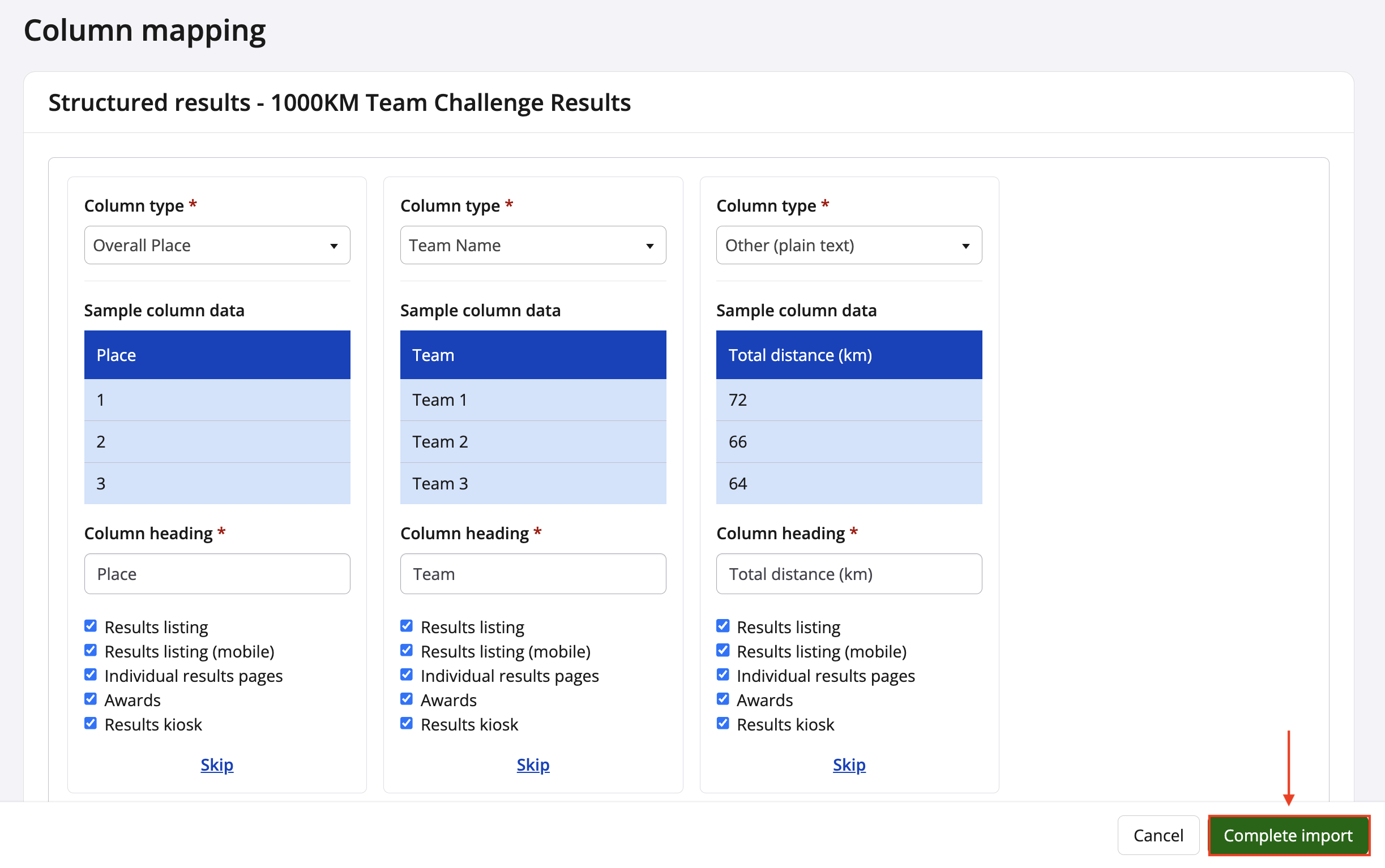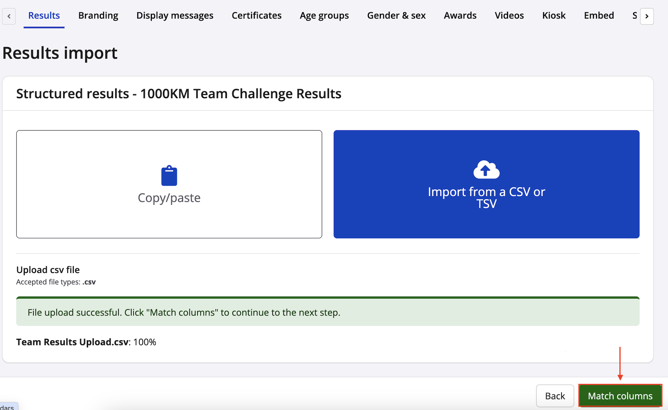 6. Select the generated aggregate team results CSV file to upload for your structured results. Click Match columns to finalize your results.