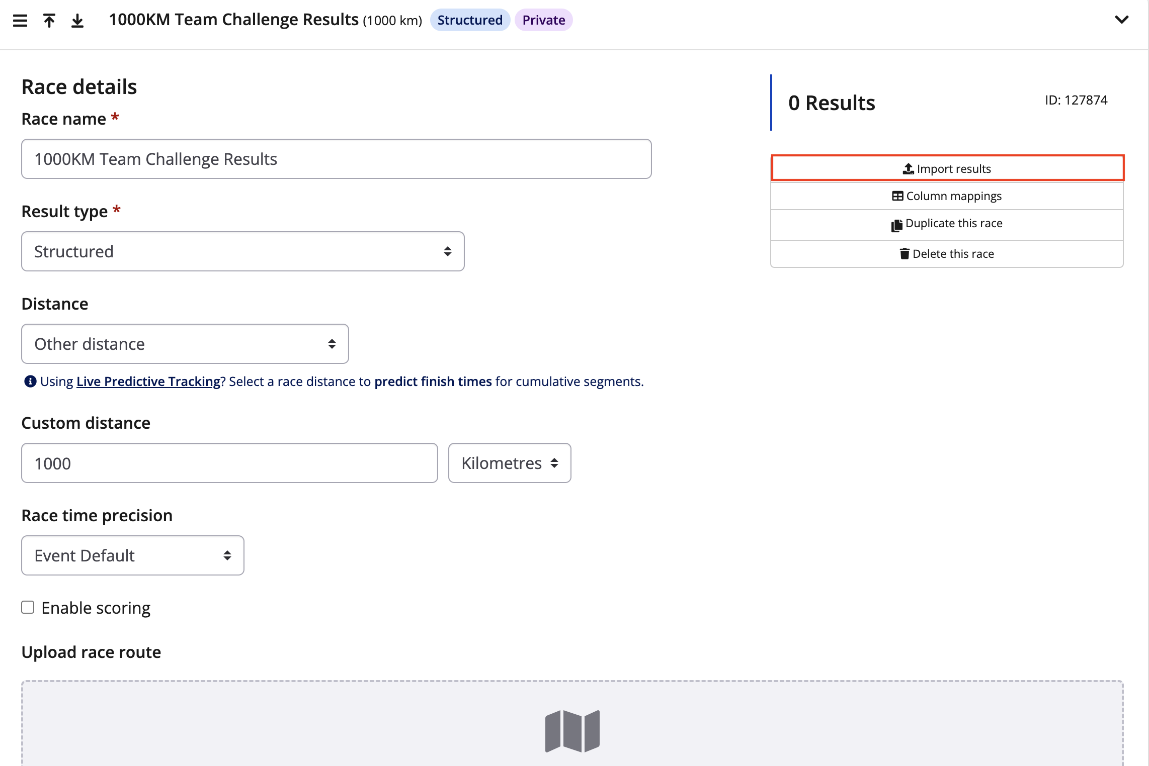 5. With your newly generated report, you will return to your results settings and create a new structured race to upload your aggregate team results. Click the Import results button from the righthand side.
