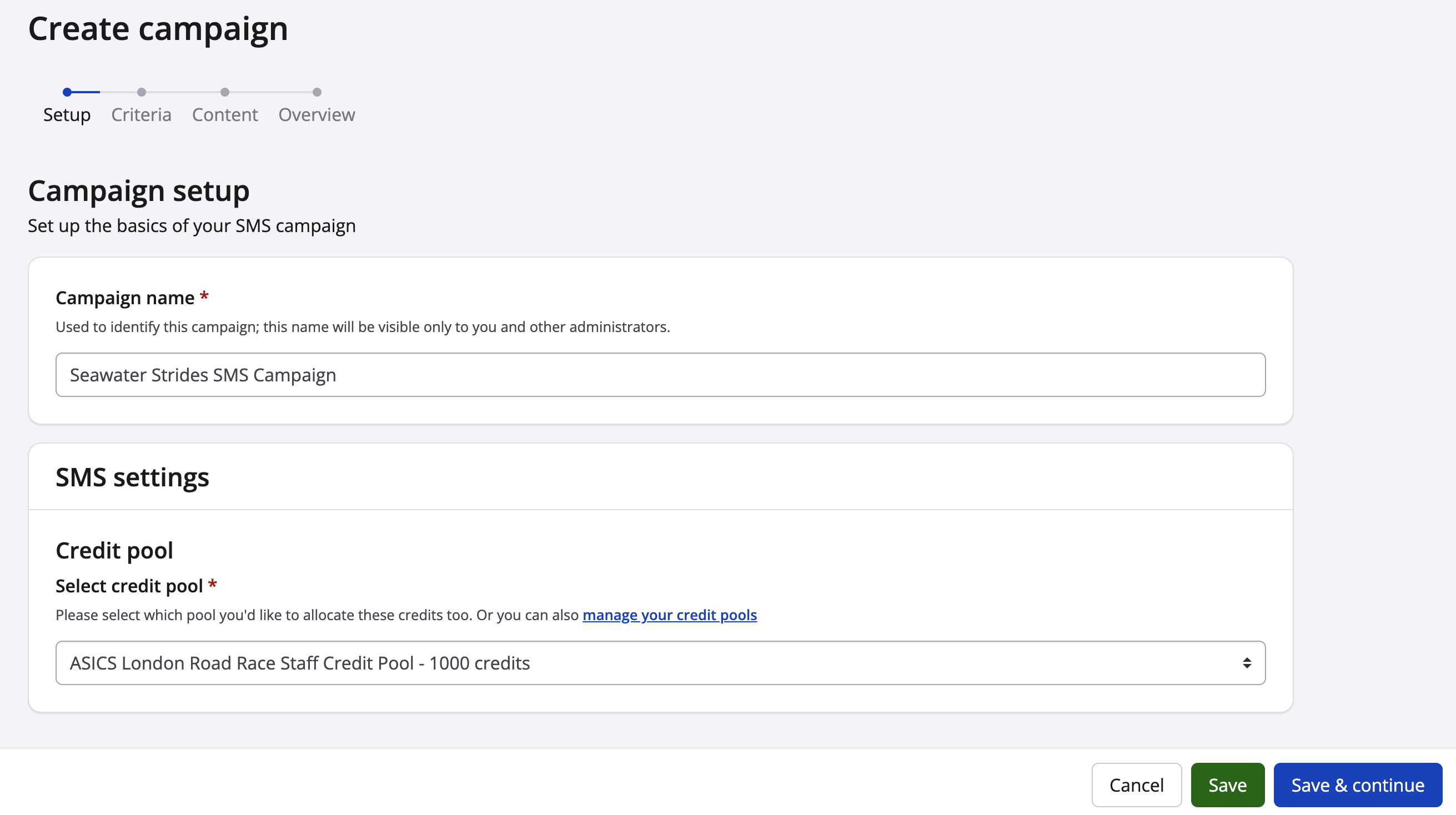 4. Creating a campaign involves four steps. The first step is to setup the campaign. Here you will want to name the campaign and select the appropriate credit pool to apply to your campaign. Please reference our guides on how to purchase SMS credits and how to share credits across organizations for more information on these processes.
