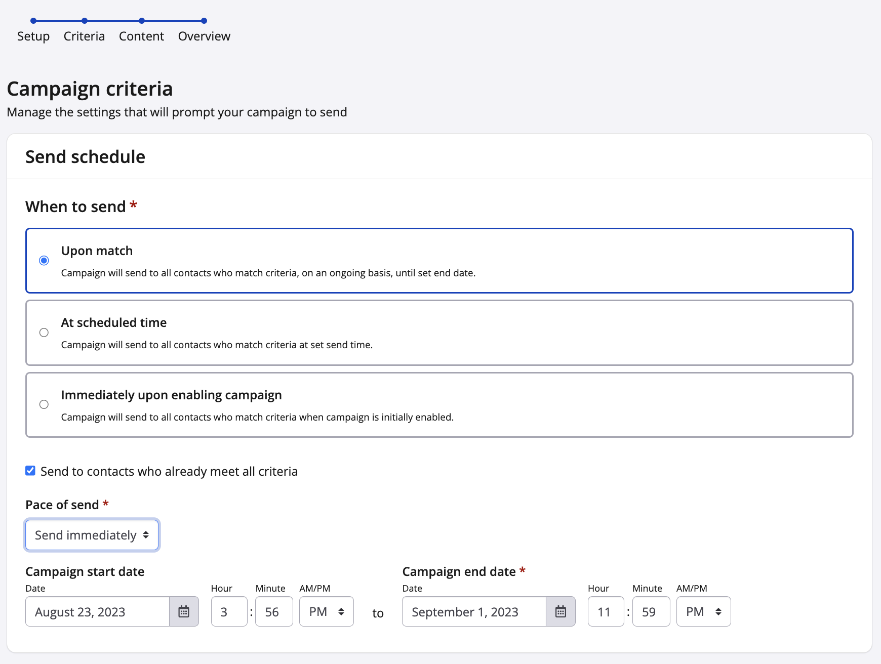 5. Next is the Criteria step. We will configure the campaign's send schedule and select when it should send. We have three options to choose for our campaign's send: