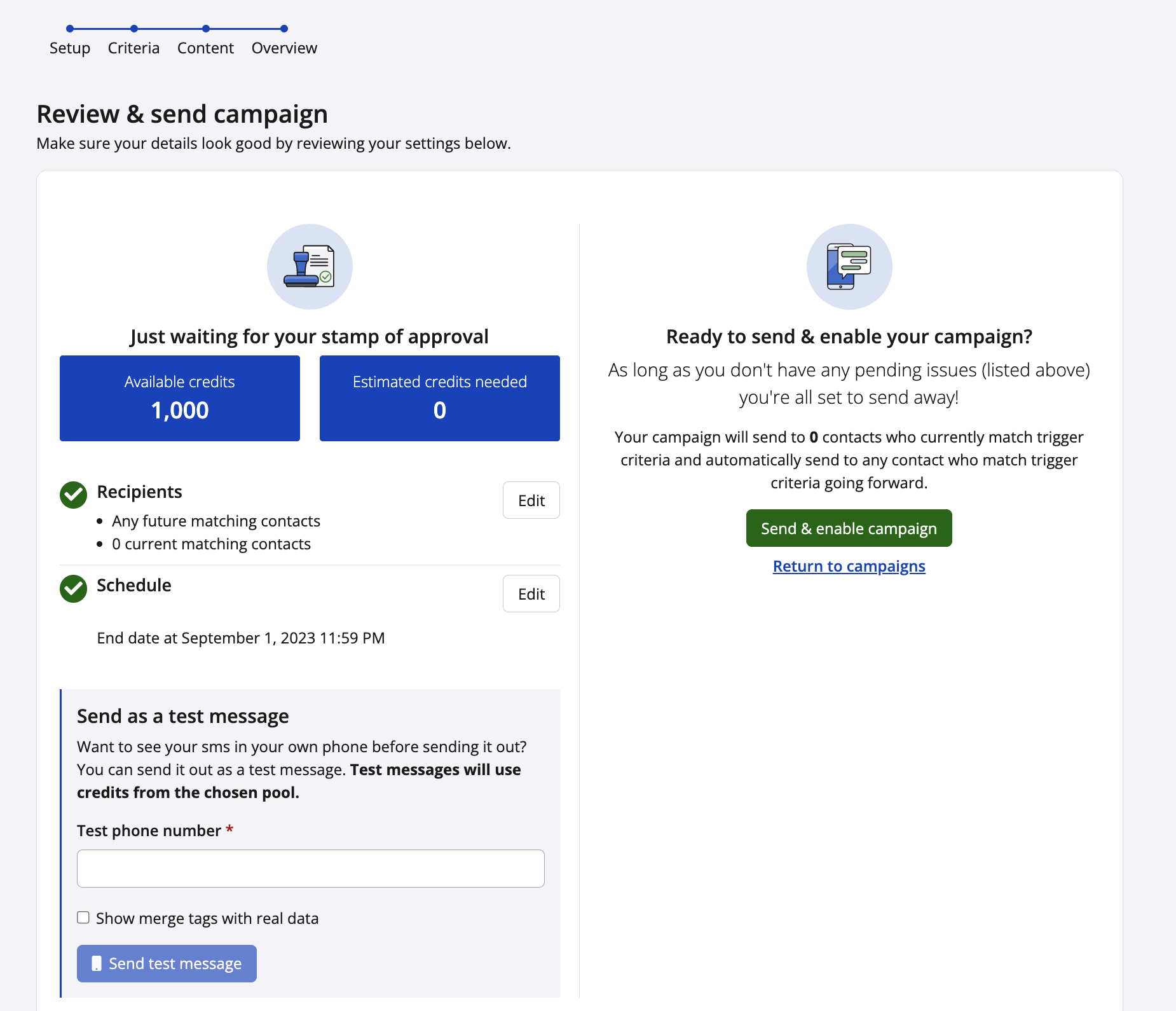 7. Next is the overview step. Your campaign details will be listed out on the left-hand side. You will be able to review your campaign to see if there are any errors or incomplete steps, review how many available credits you have to use, and send a test test message to yourself (test messages will use available credits).
