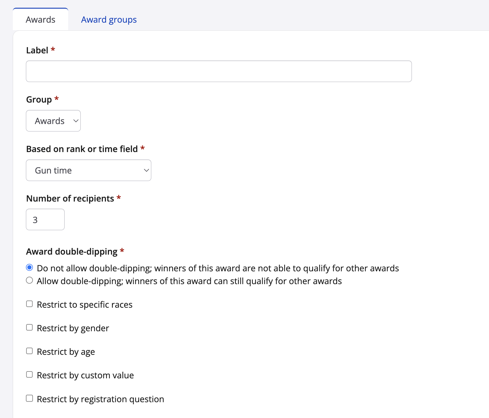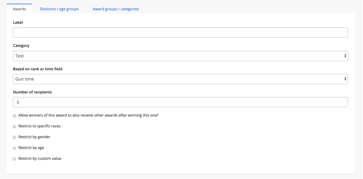 You have the option to create divisions or age groups and award groups/categories. Creating additional award groups can help organize awards on your results page.
