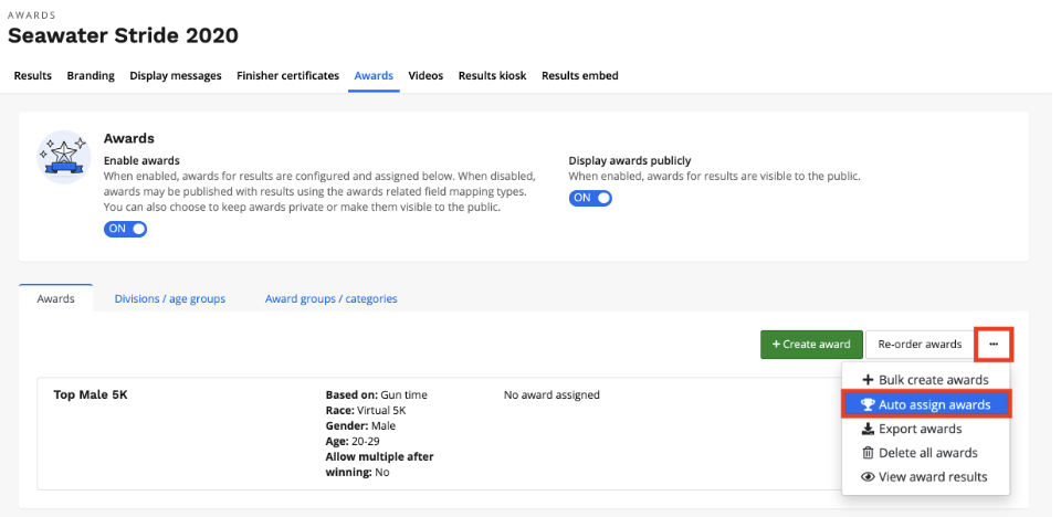 7. When you're ready to assign awards after creating your award(s), return to the Awards overview page and click the three-dotted action button and select Auto-assign awards.