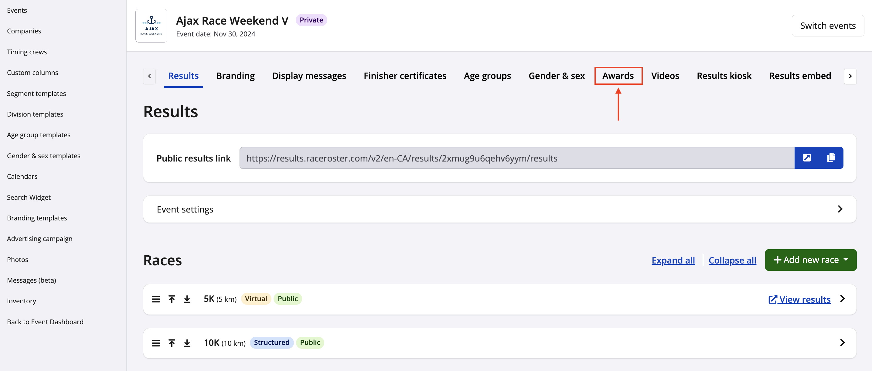 9. Find the Awards tab next to Results to view award winners, or view the small trophy icon located within a runner's result to see if they were a winner of an award.