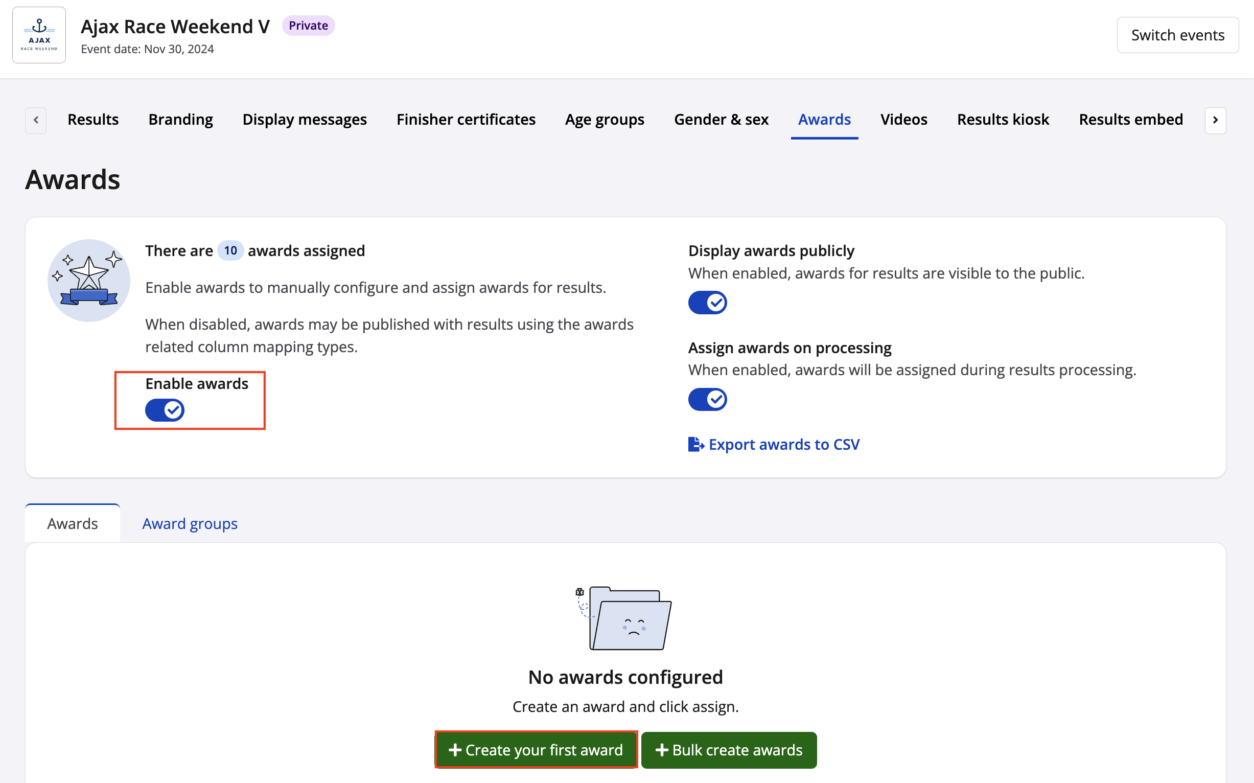 8. To make the results viewable to the public, click the toggle under Display awards publicly.