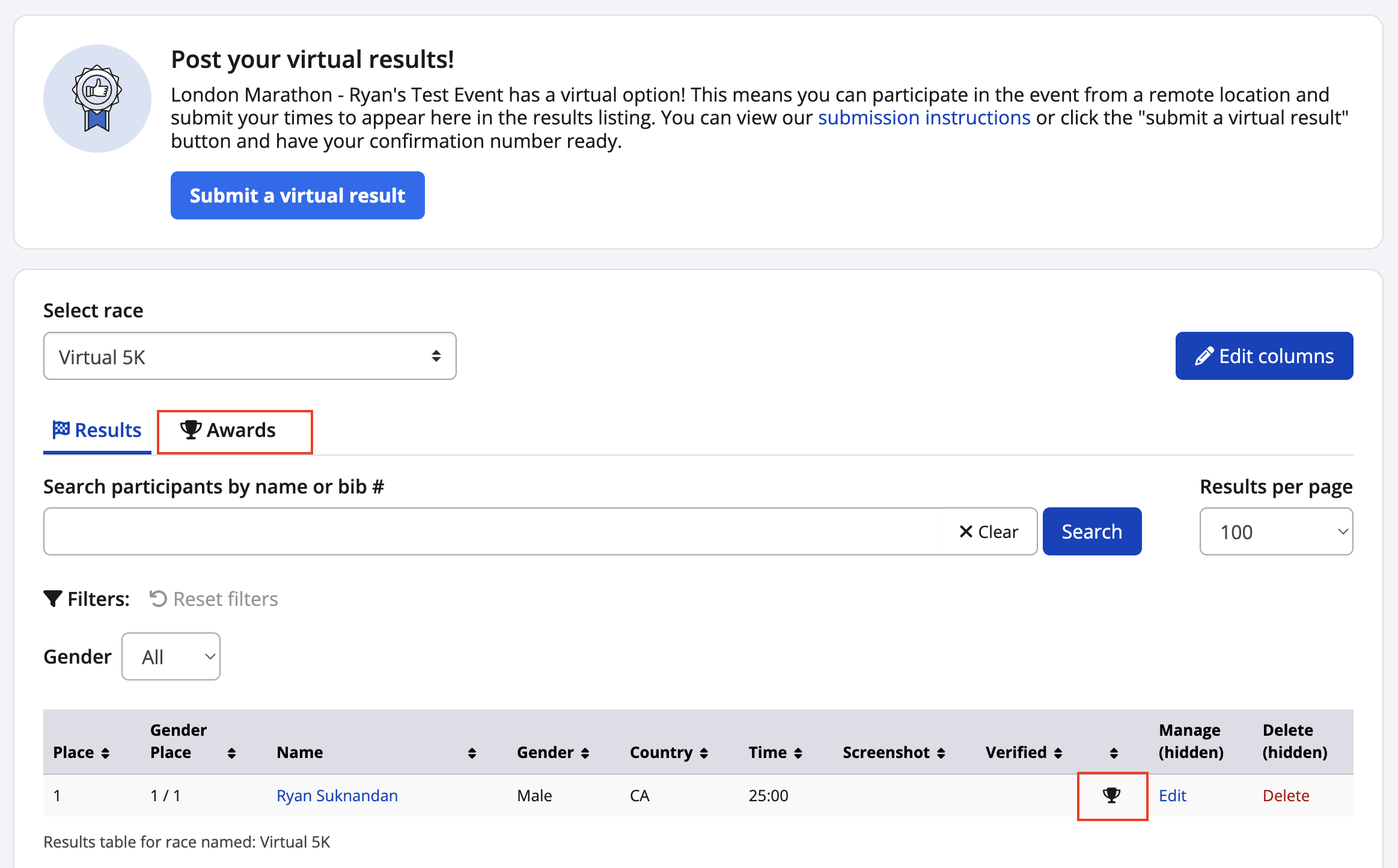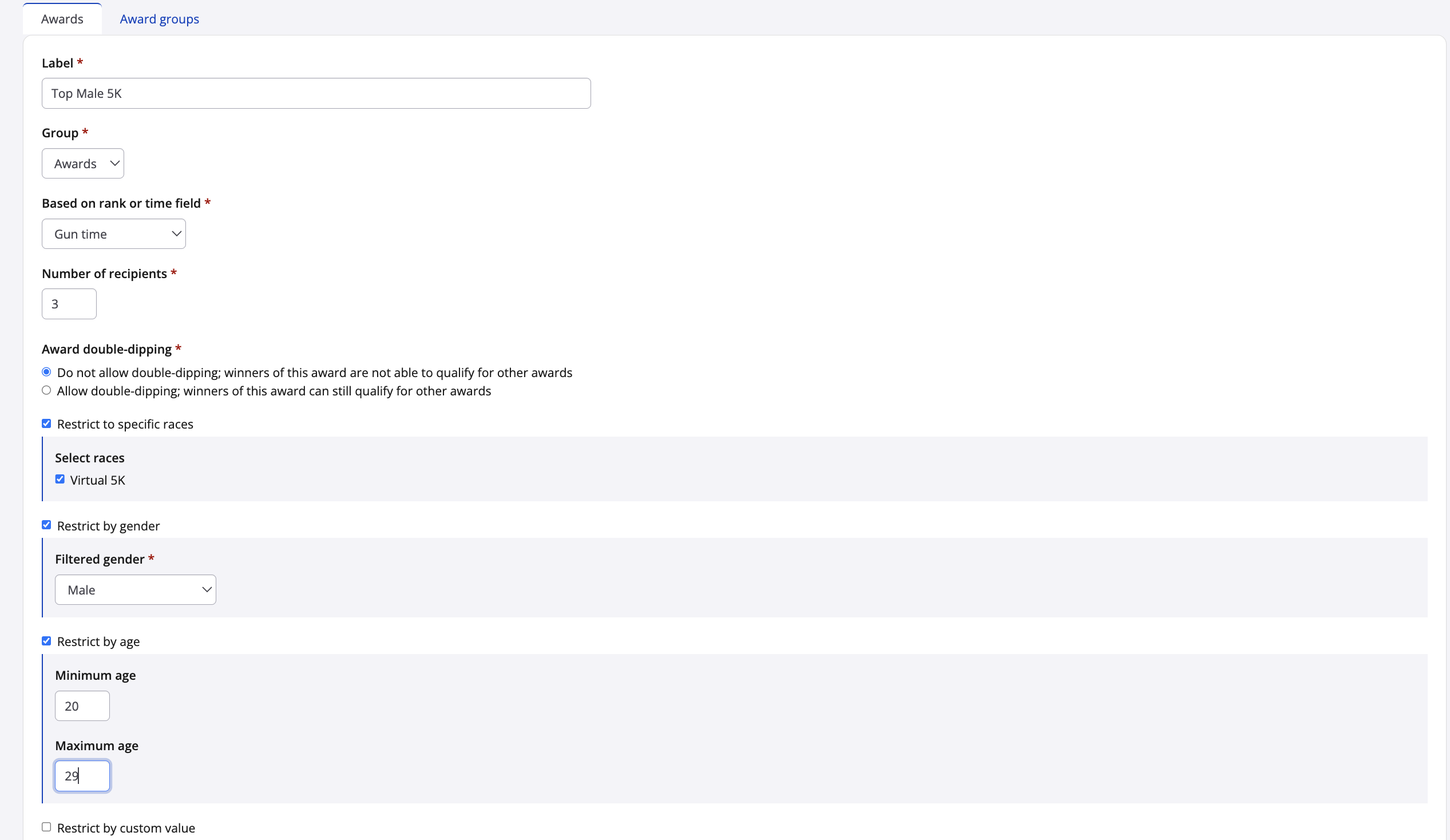 As an example, I created the top 3 male finishers award.