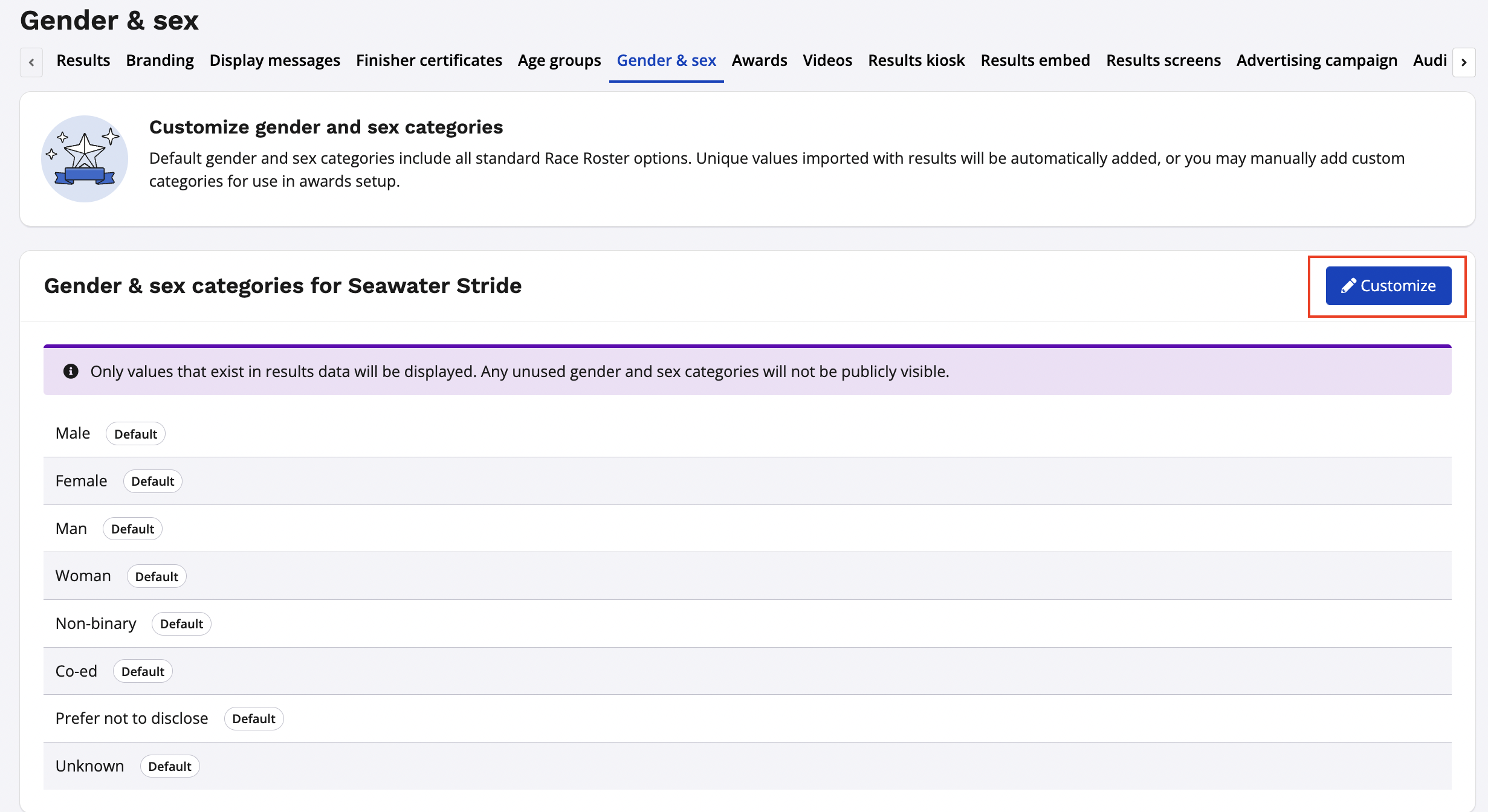 Timers and event organizers now have the ability to create and display any gender within their results leaderboards, or assign awards based off of any gender. This new functionality allows results data to display within Race Roster with any gender that a participant may identify with.