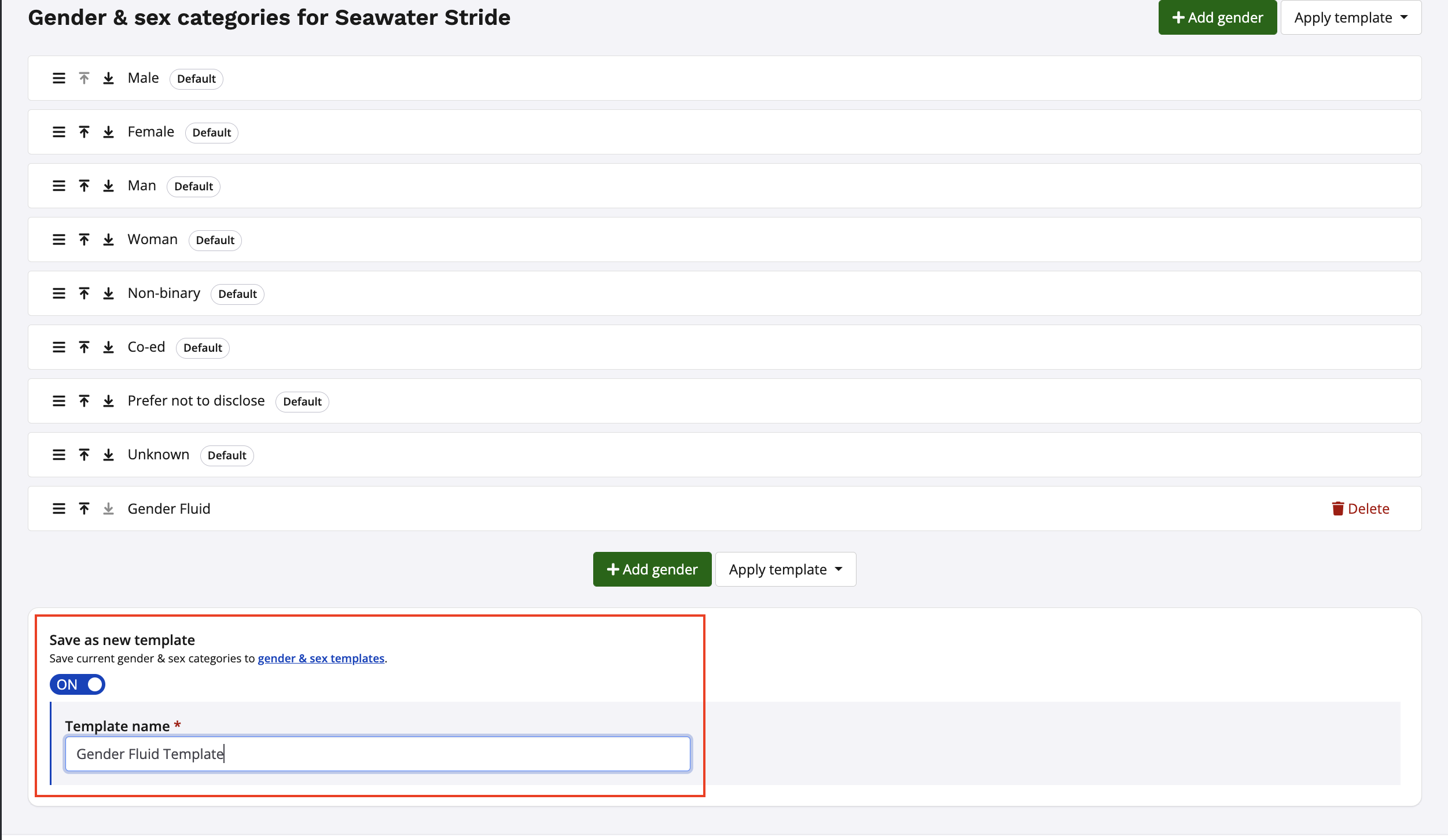 Optional: Toggle the Save as new template settings ON if you wish to save your list of custom genders as a template that can be re-used for future events. Click save once you've named your template.