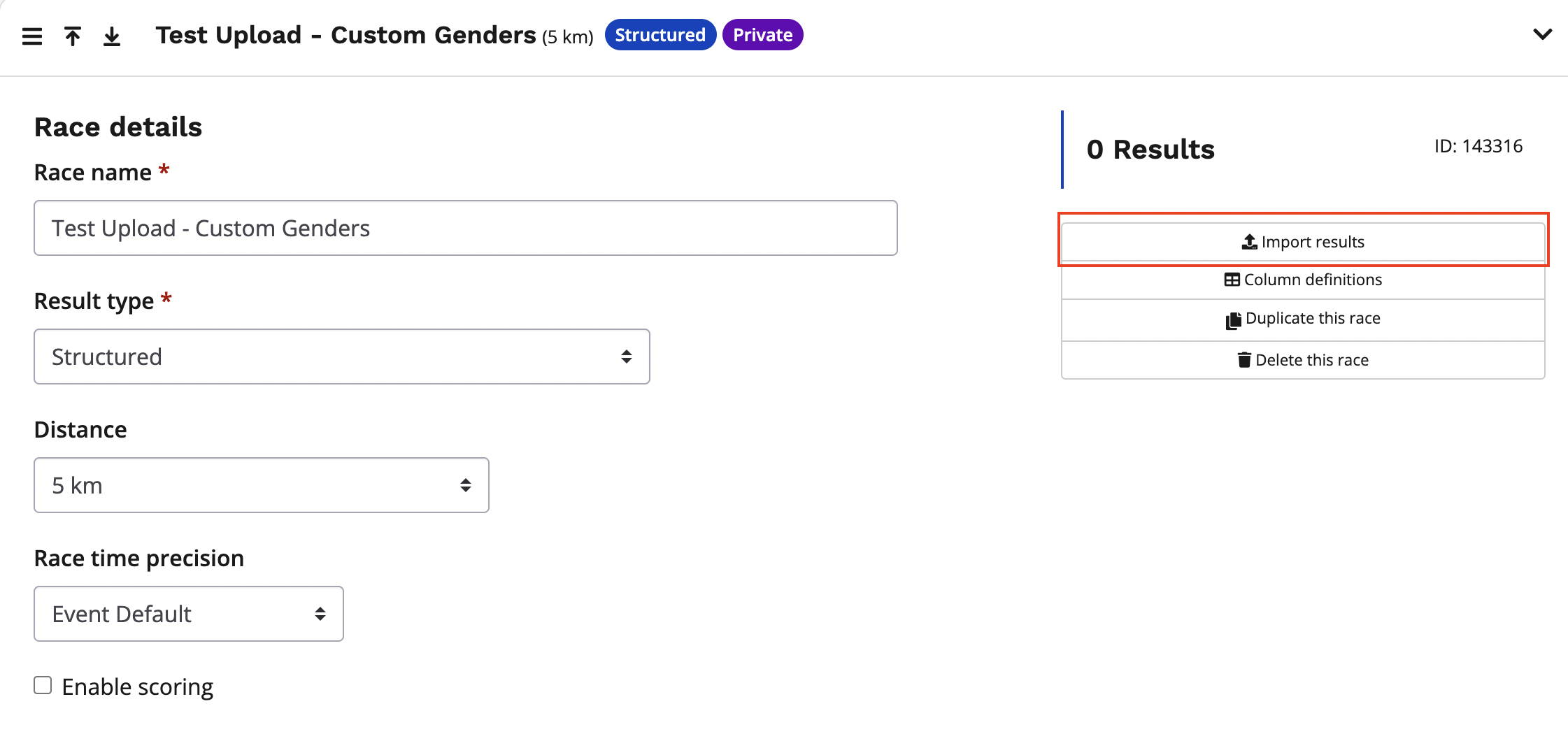 2. From your results settings, create a structured race and click the import results button from the righthand side menu
