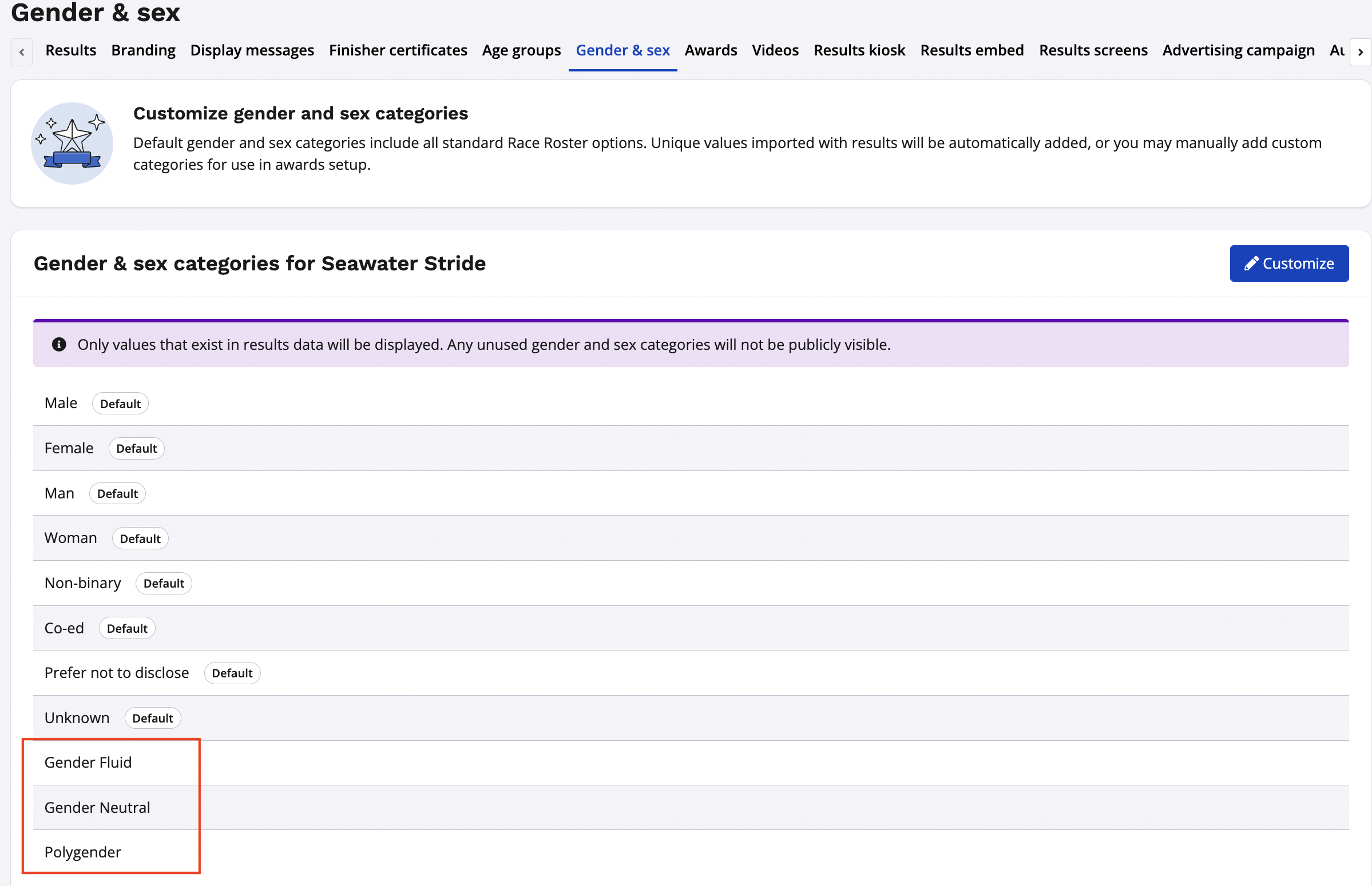 3. From your Gender & Sex settings, click on the customize button to create new genders that you wish to be included in your results data, or to re-order your list of custom genders.