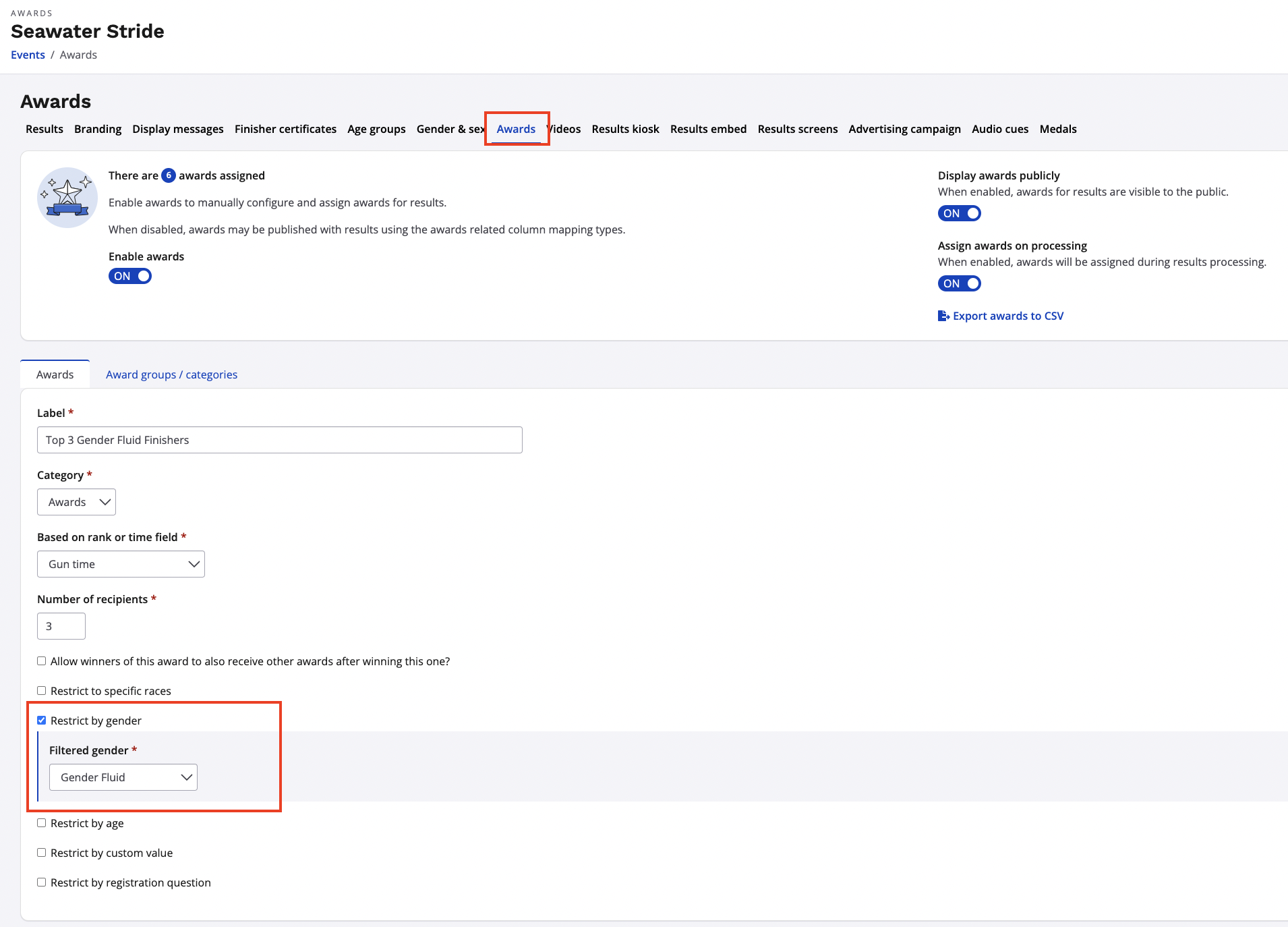 5. From your awards section within your results settings, you can now restrict the winners of an award based off the custom gender that you just created. Any custom genders created will appear as an option to restrict for an award. (Please read our article how to create and assign awards to learn more about this process)
