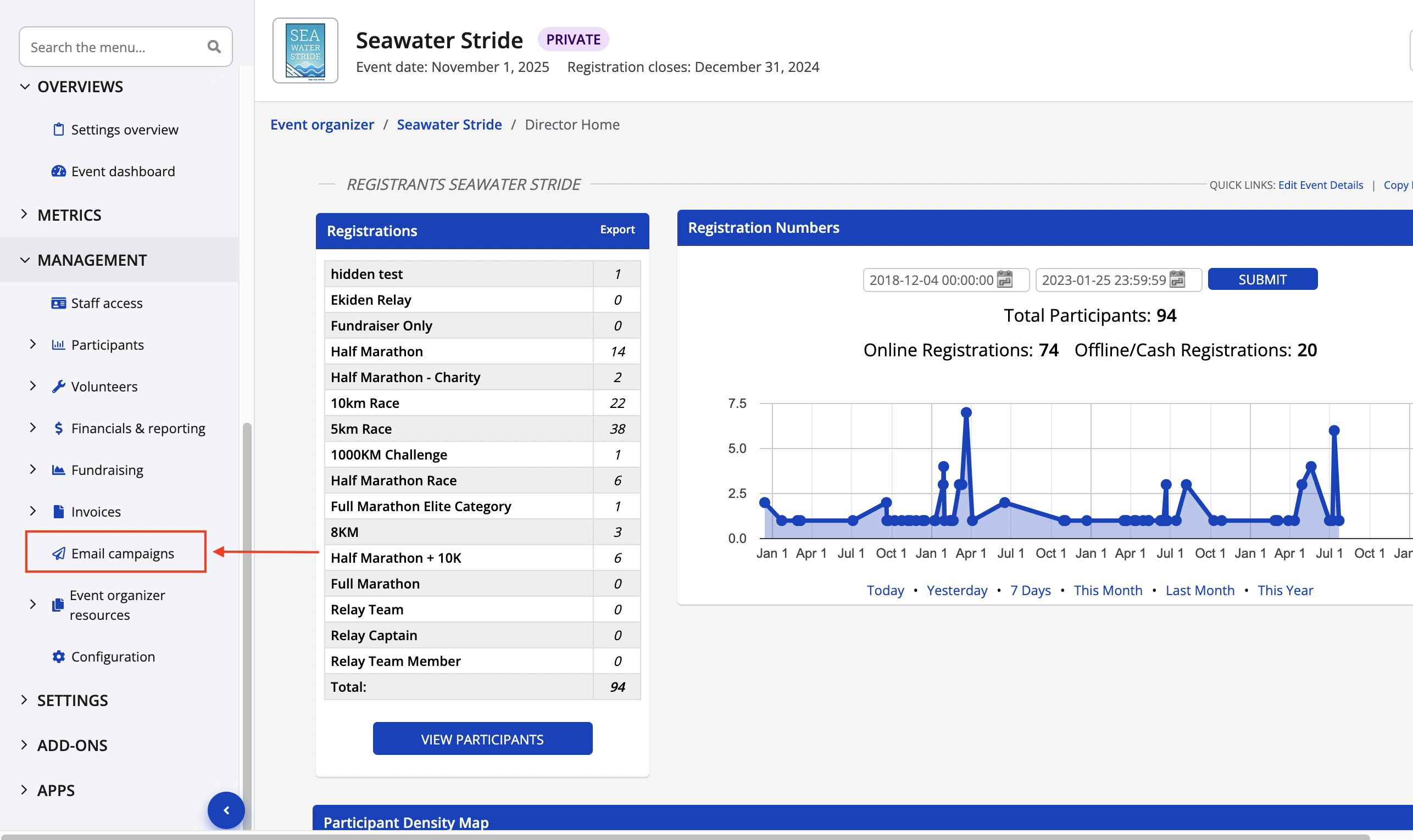 1. From your event dashboard, click on email campaigns under the management tab from the lefthand side menu