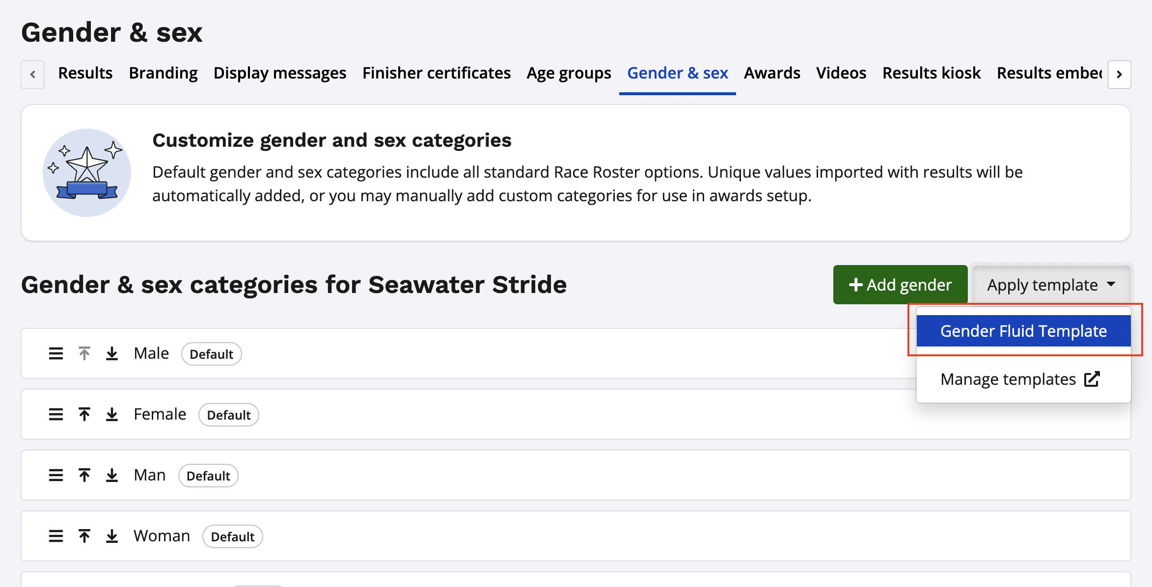 Custom genders can now be created to allow for participants to be listed as any preferred gender within your results leaderboards and race awards. Timers and event organizers can also create gender & sex templates which can be re-used at a later time for future events.