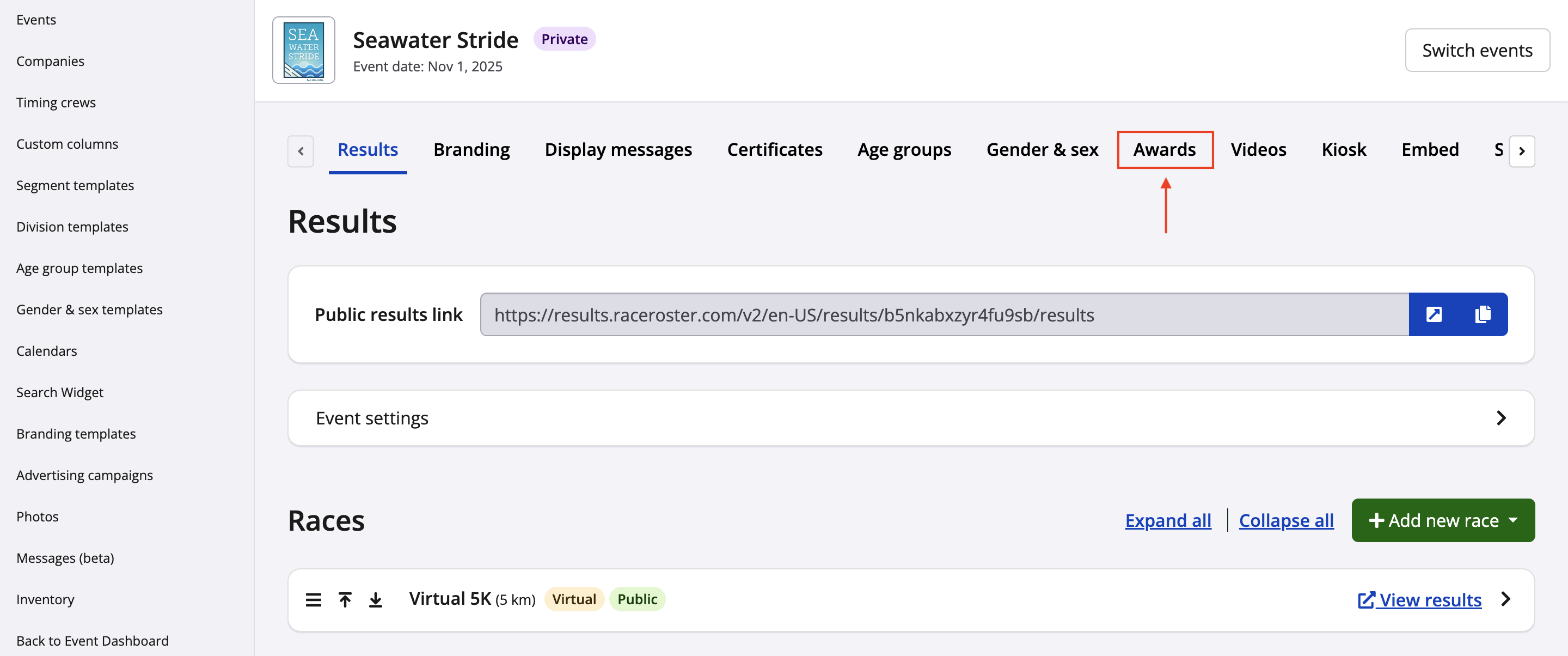 5. After duplication, you will find a copy of all of the selected races within your results dashboard, as well as all duplicated awards within the Awards tab. Awards can be edited further if desired within the Awards tab.