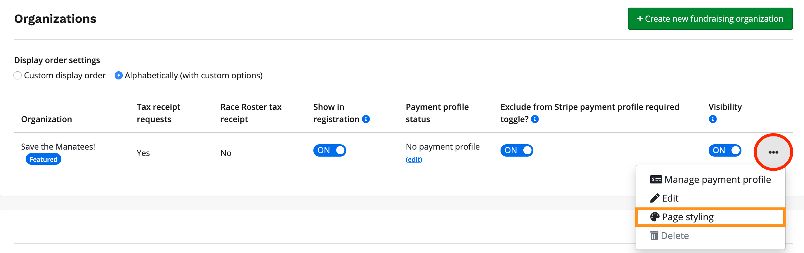 3. Select the "..." button next to the name of the fundraising organization followed by Page styling.