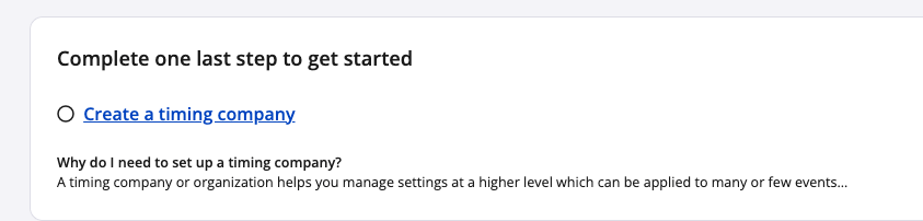 2. In order to have a Timer Dashboard, you must create a Company. A timing Company or organization helps you manage settings at a higher level which can be applied to many or few events To create a Company select Create a timing company.