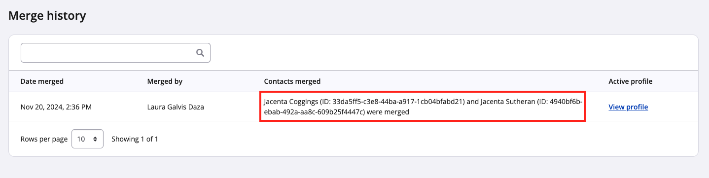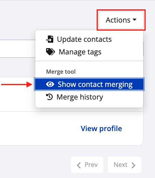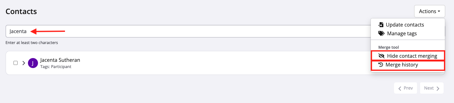 5. On the next page, you can search for the now-merged contact. If needed, you may use the "Action" dropdown to hide the contact merging tool, or visit the merge history page to view past merges.