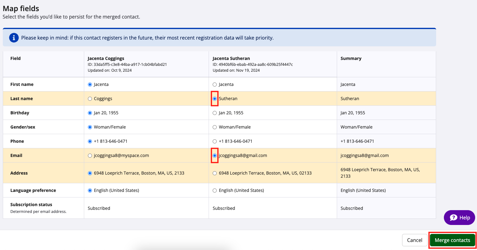 Use the radio buttons to select the contact's most up-to-date data, row by row. Then, click the green "Merge contacts" button.