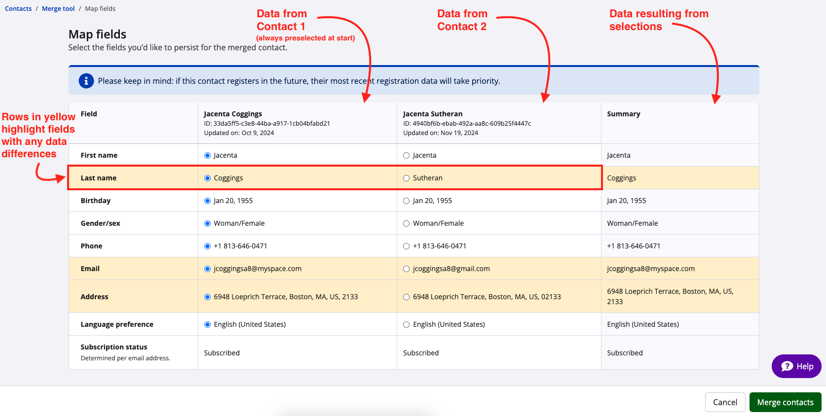 - Any rows highlighted in yellow indicate that there's a difference in the data between the two contacts.