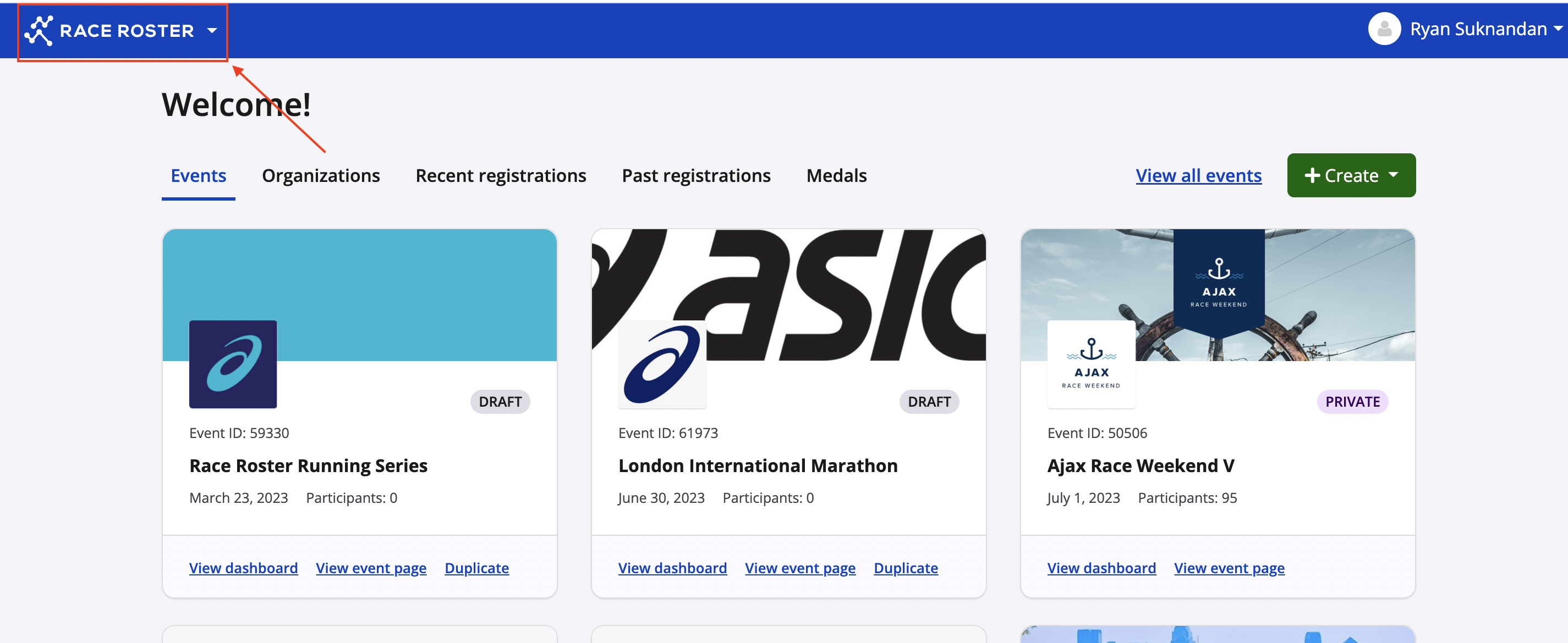 This article will outline the different ways to find and navigate across your different organizations that you've created when logged into your Race Roster account.