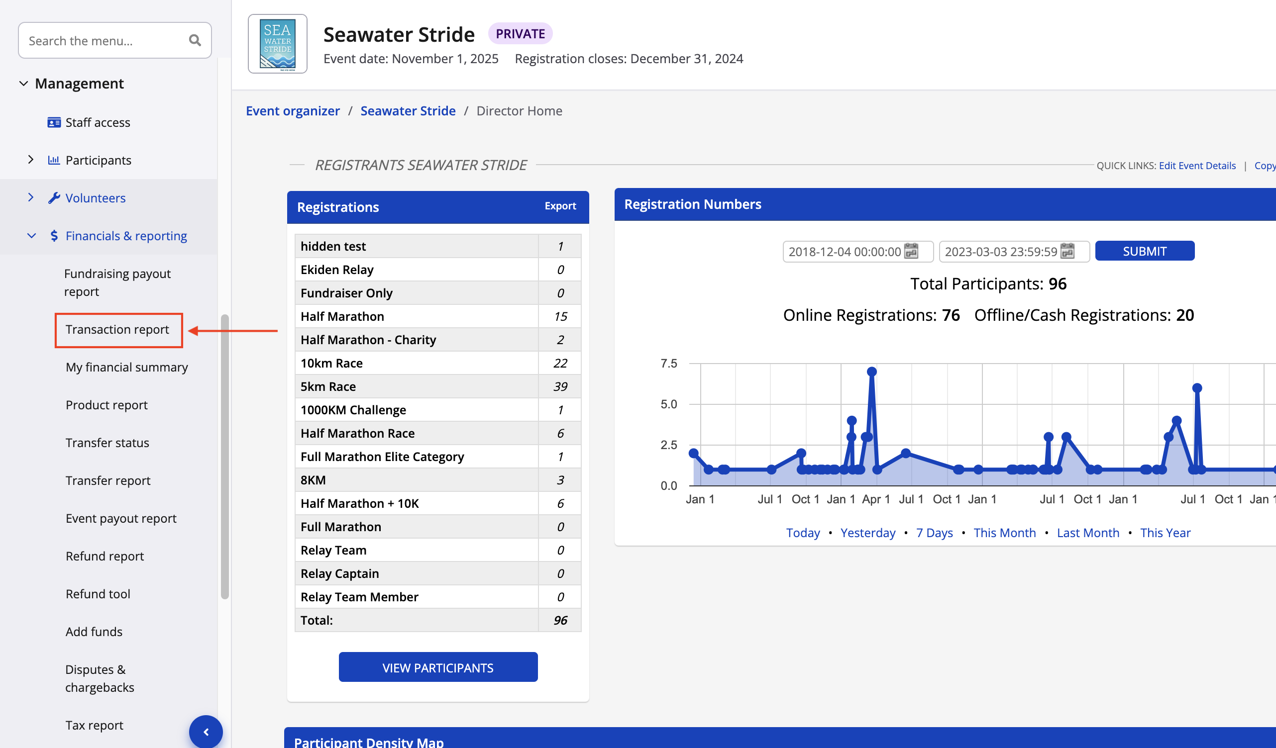 1. From your event dashboard, click on management -> financials & reporting -> transaction report from the lefthand side menu