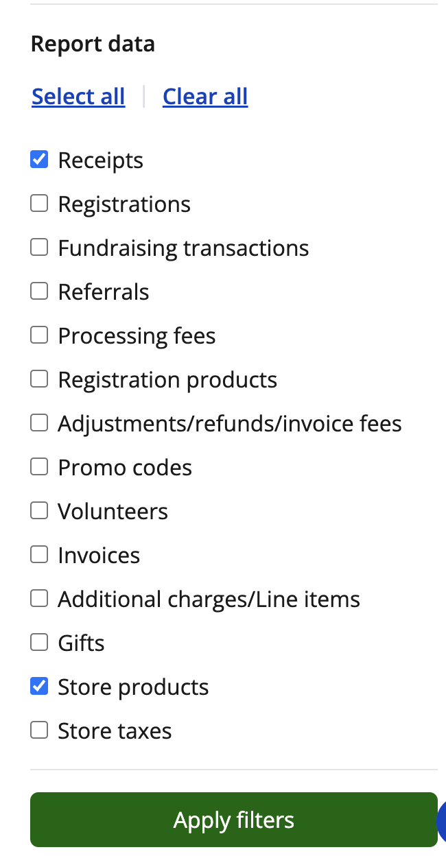 2. From your transaction report, set your preferred date ranges, and filter your report data to specifically look for receipts (Note: including store products in your search may help to track individual purchases). Click apply filters to begin your search.
