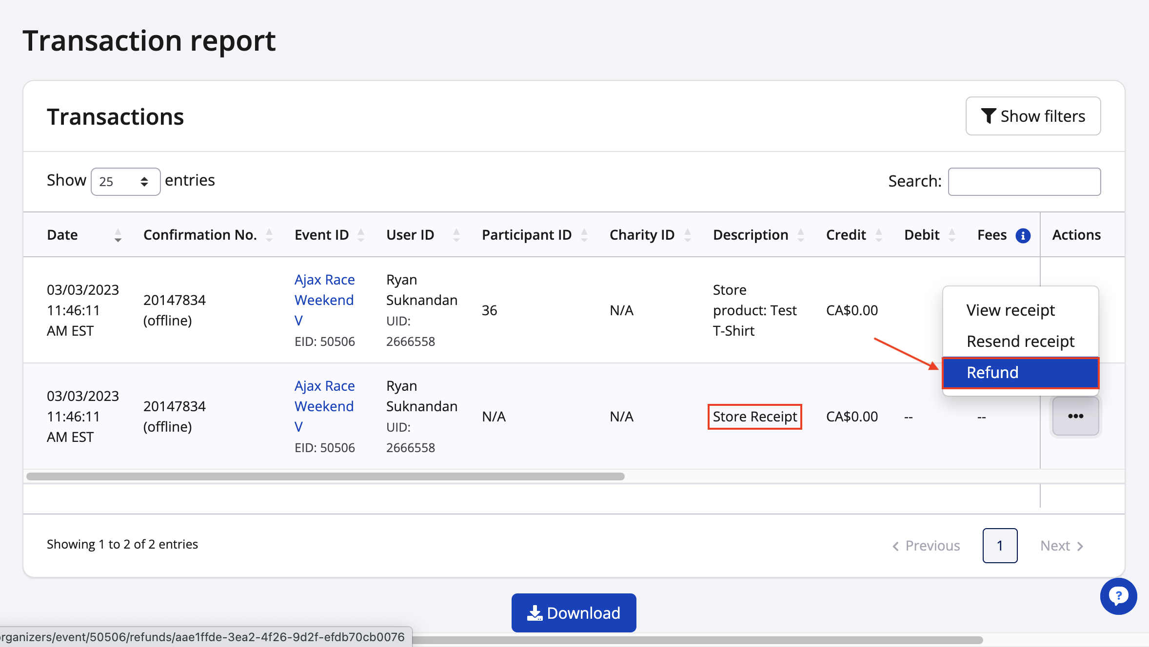3. Conduct your search by using a participant's name or confirmation number. After finding the store receipt for the transaction from your search, click on the white button under the actions tab for that transaction and click on the refund option.