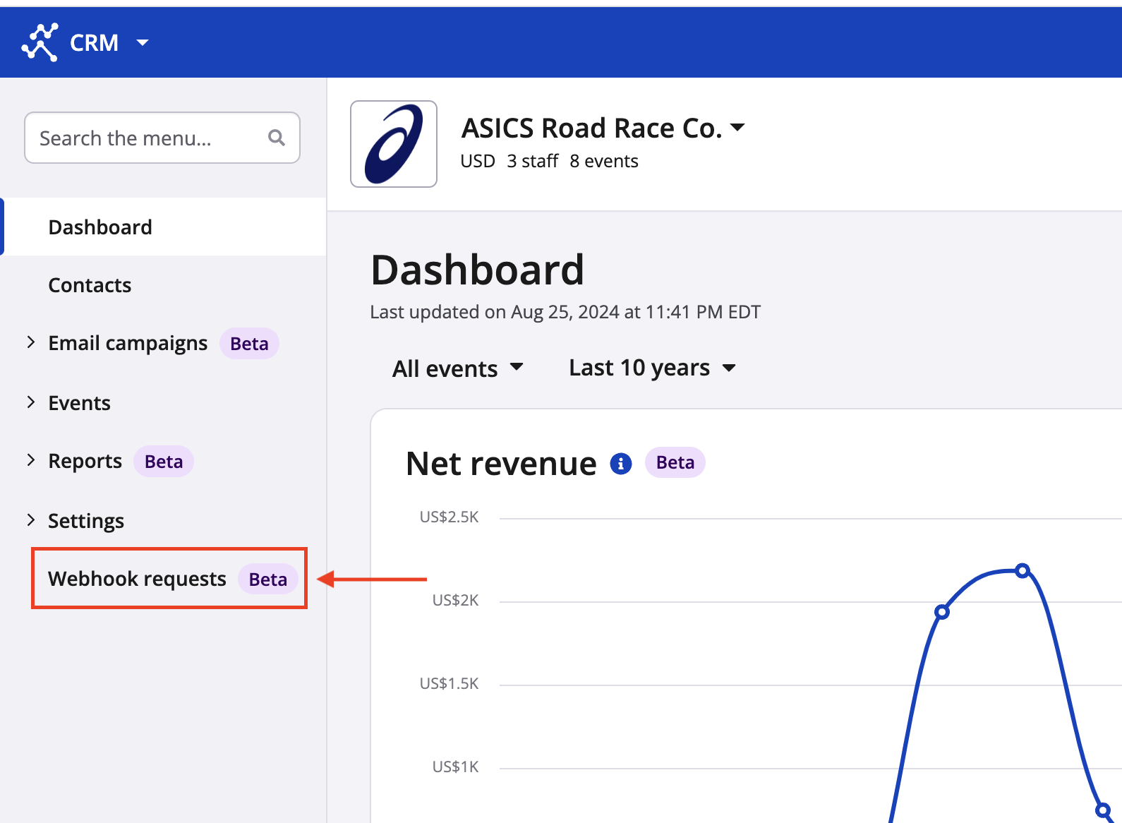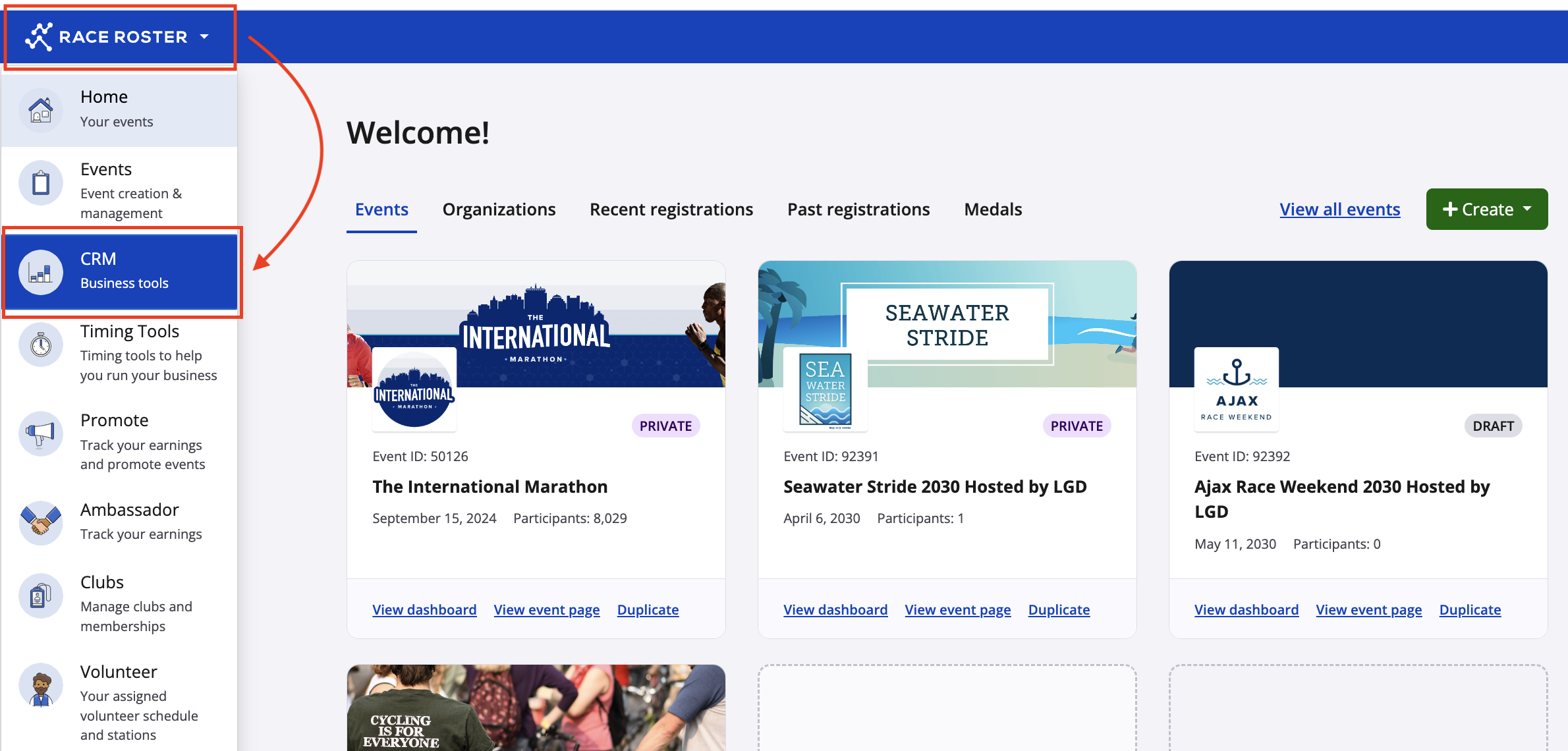 1. Log in to your Race Roster account and land on your homepage. Use the kingdom switcher on the top left to select "CRM" and access the tool.