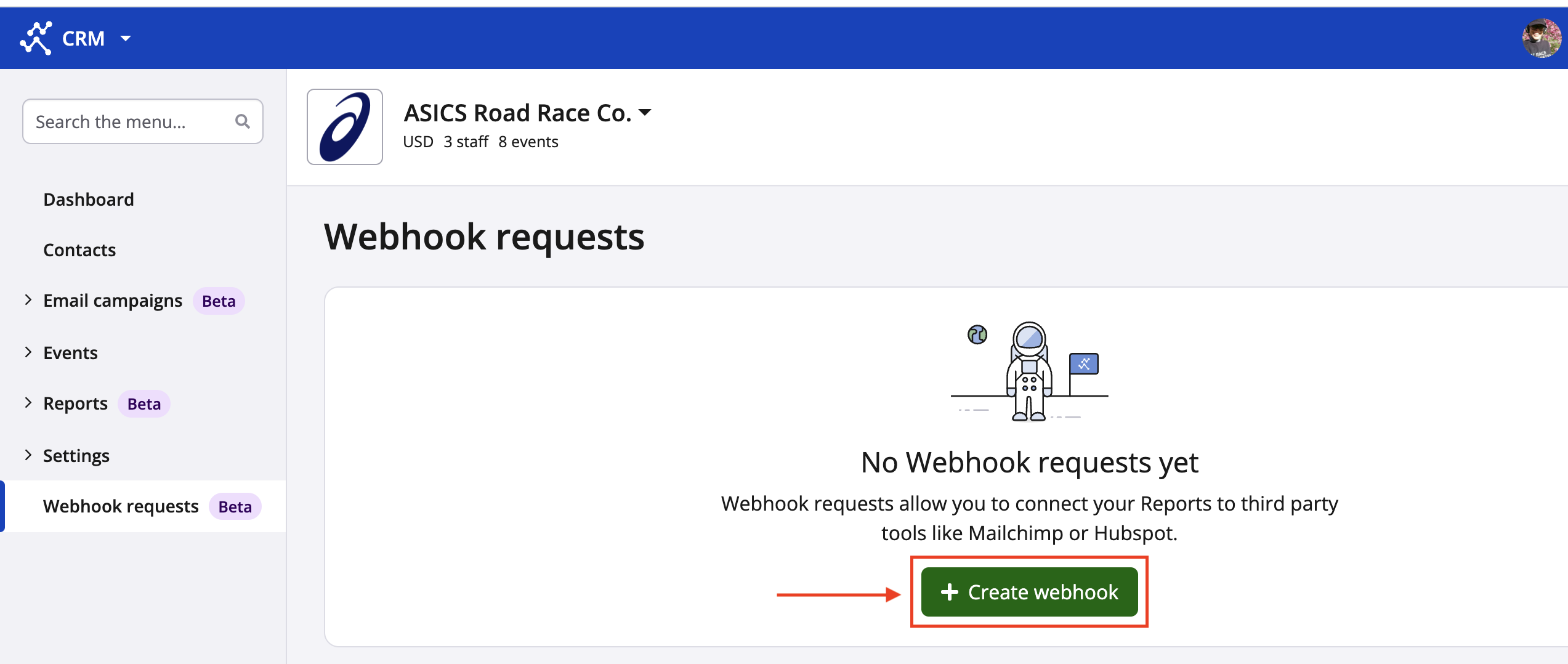 4. Click "+ Create webhook". You will need to have at least one available report in order to create a webhook request, as reports contain the contacts that will feed into the webhook.