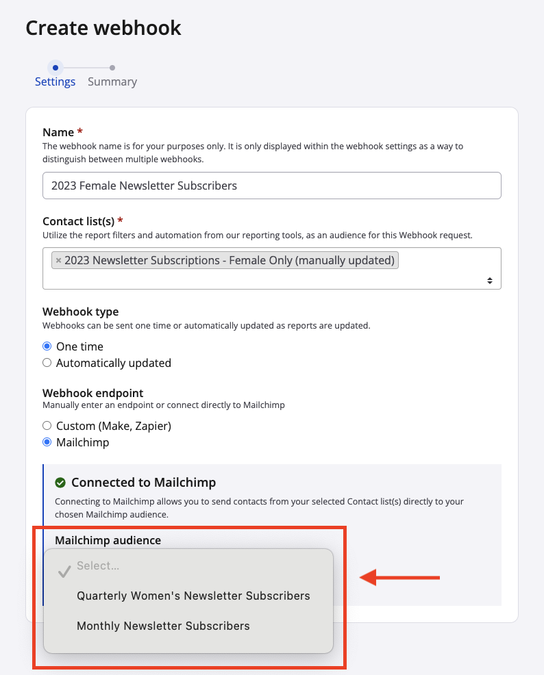 5. Name the webhook. The name is for you and your organization's staff to distinguish between different requests. For example, you might create one webhook request containing female contacts who opted into receiving your organization's newsletter across all 2023 Race Roster events. Then, the following year you might want to do the exact same thing. In this case, you might call the first webhook "2023 female newsletter subscribers" and the second "2024 female newsletter subscribers".