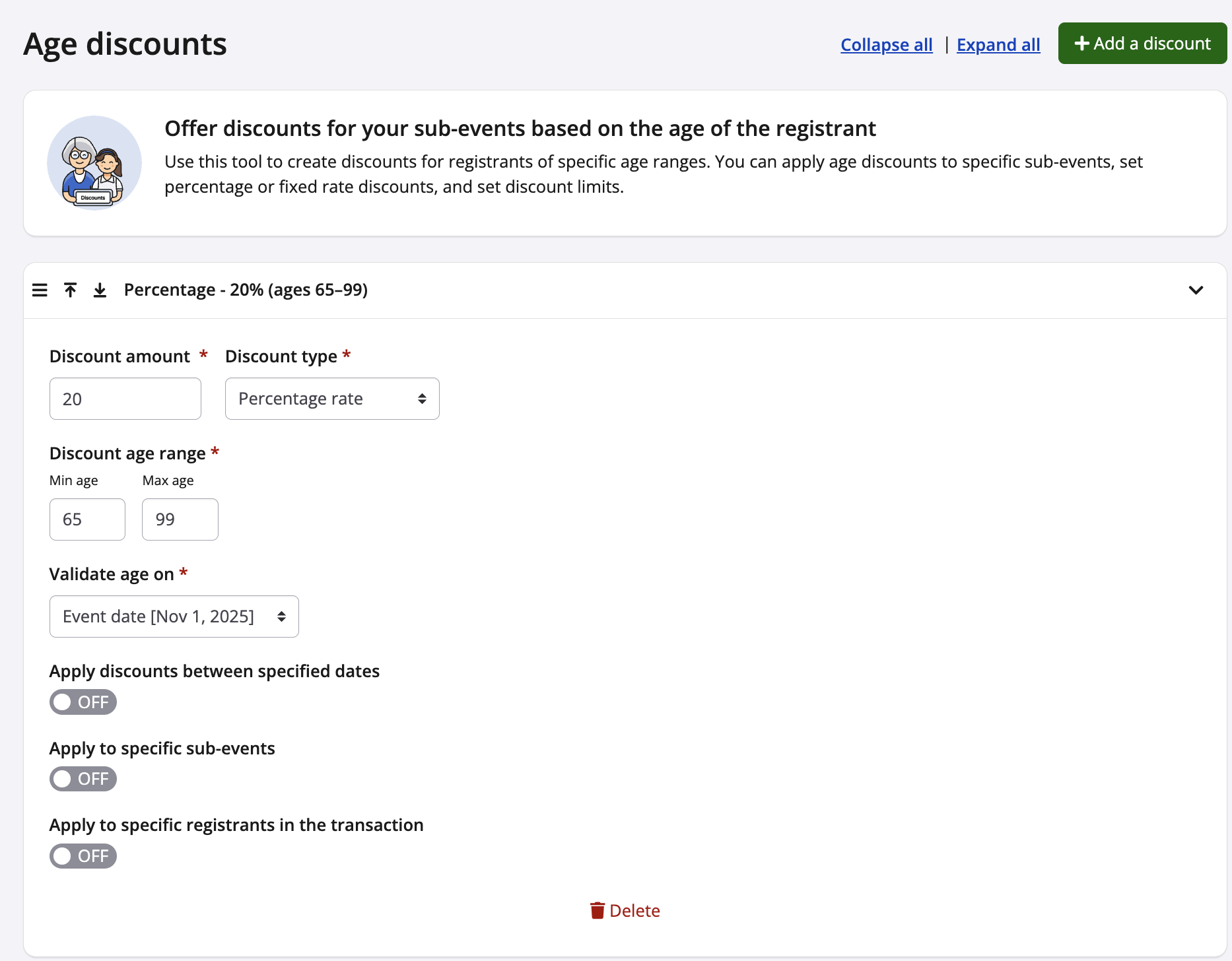 - Only apply to specific sub-events: This will allow you to only apply the age discount to specific sub-events.