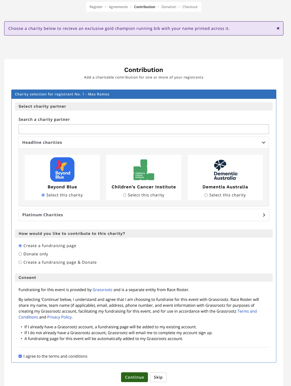The participant must also give agree to our terms and conditions stating that Race Roster will be sharing the participant's registration details with Grassrootz to create a fundraising page.