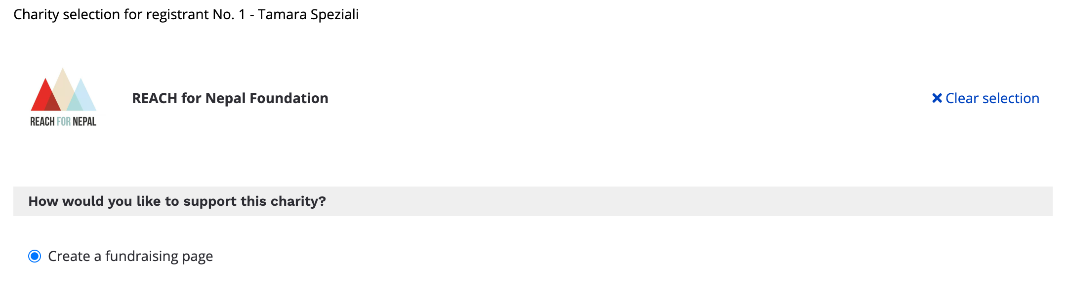 If one or both of the "show in registration" or "visibility" toggles is turned OFF for a charity, registrants will not be able to make a donation towards that charity within registration. Registrants will be limited to creating a fundraising page on Grassrootz without completing a donation (see below).