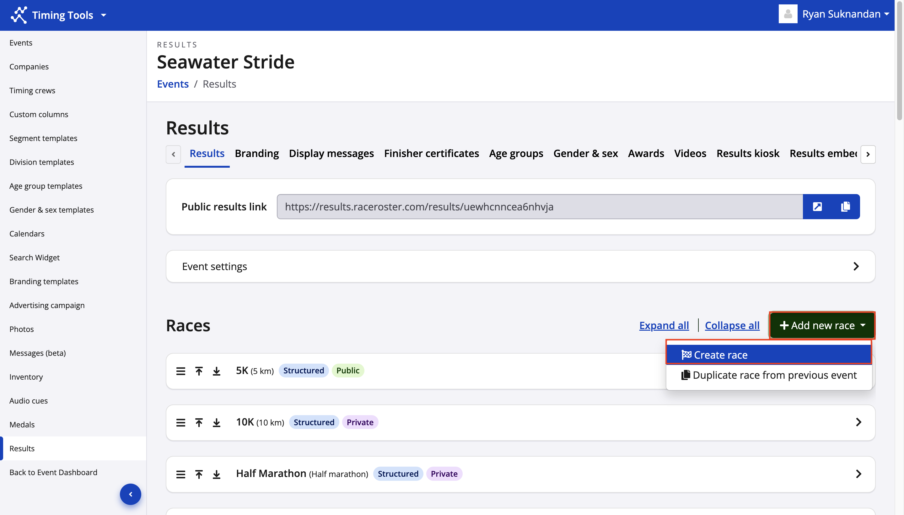 2. From your results dashboard, click Add new race -> Create race to begin setting up the race leaderboard that will be using live predictive tracking.