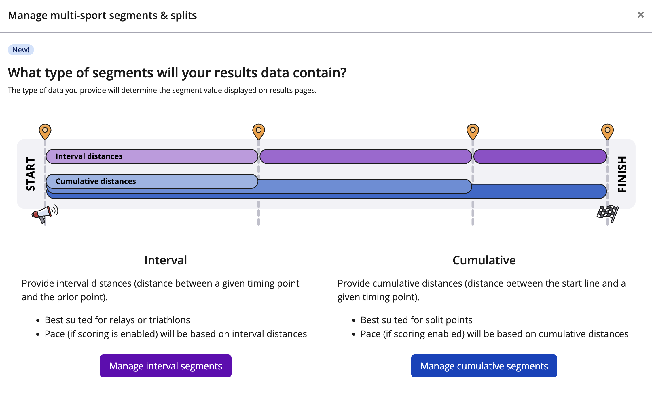 5. Next, configure the segments for the race depending on how you would like the live predictive tracking to display. The two options of segment types to create for your results set are: