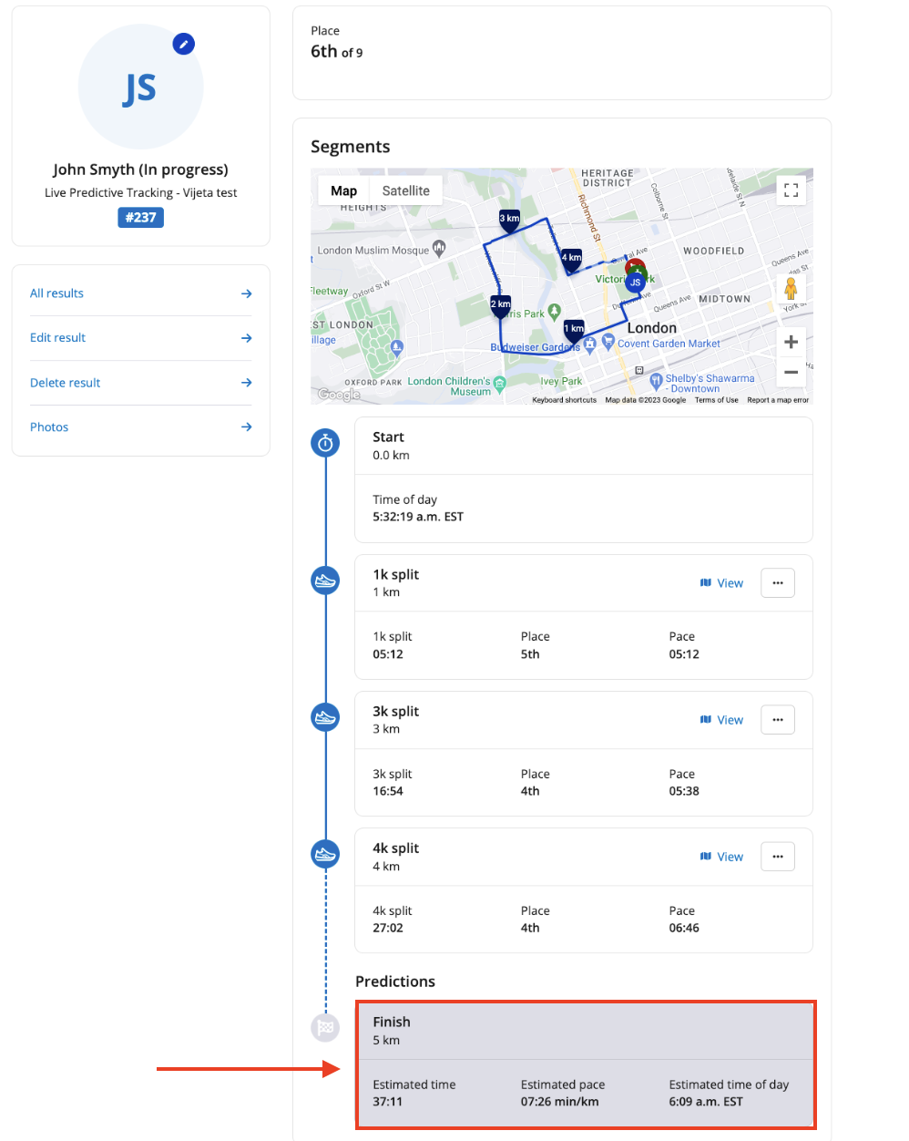 9. As the timer uploads new results data for your race with updated split times included, the participant's progress from the uploaded race route map will update on their individual result page. Completed segments will display within the white cards below the race route displaying the runner's split times throughout the course. The predictions for the upcoming splits will appear in the grey cards with estimations on when the runner will complete this segment.
