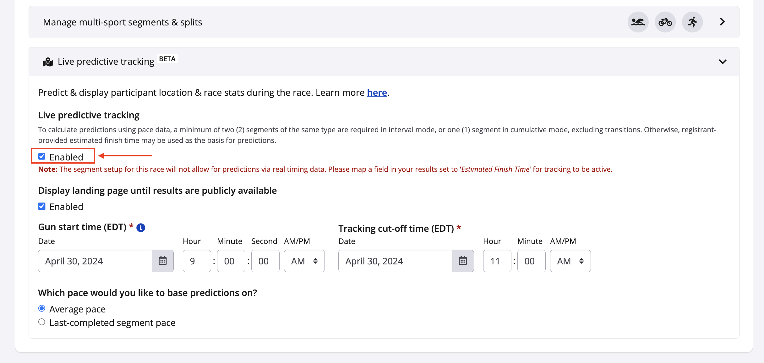 6. Scroll down to the live predictive tracking settings and enable the setting by clicking the checkbox provided. Insert a default gun start time to be used in the case that chip time or segment time are not available.