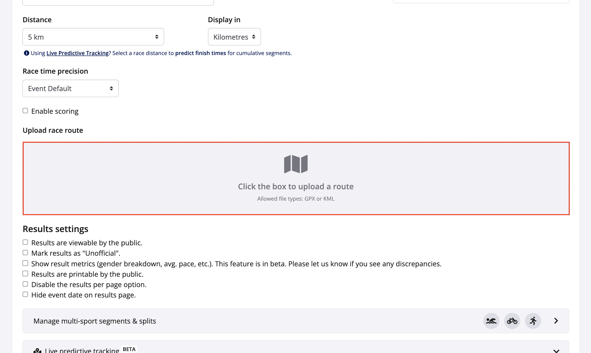 5. Upload a race route to your event by selecting a GPX or KML map file. A race route must be uploaded in order to properly plot runners on a visual map.