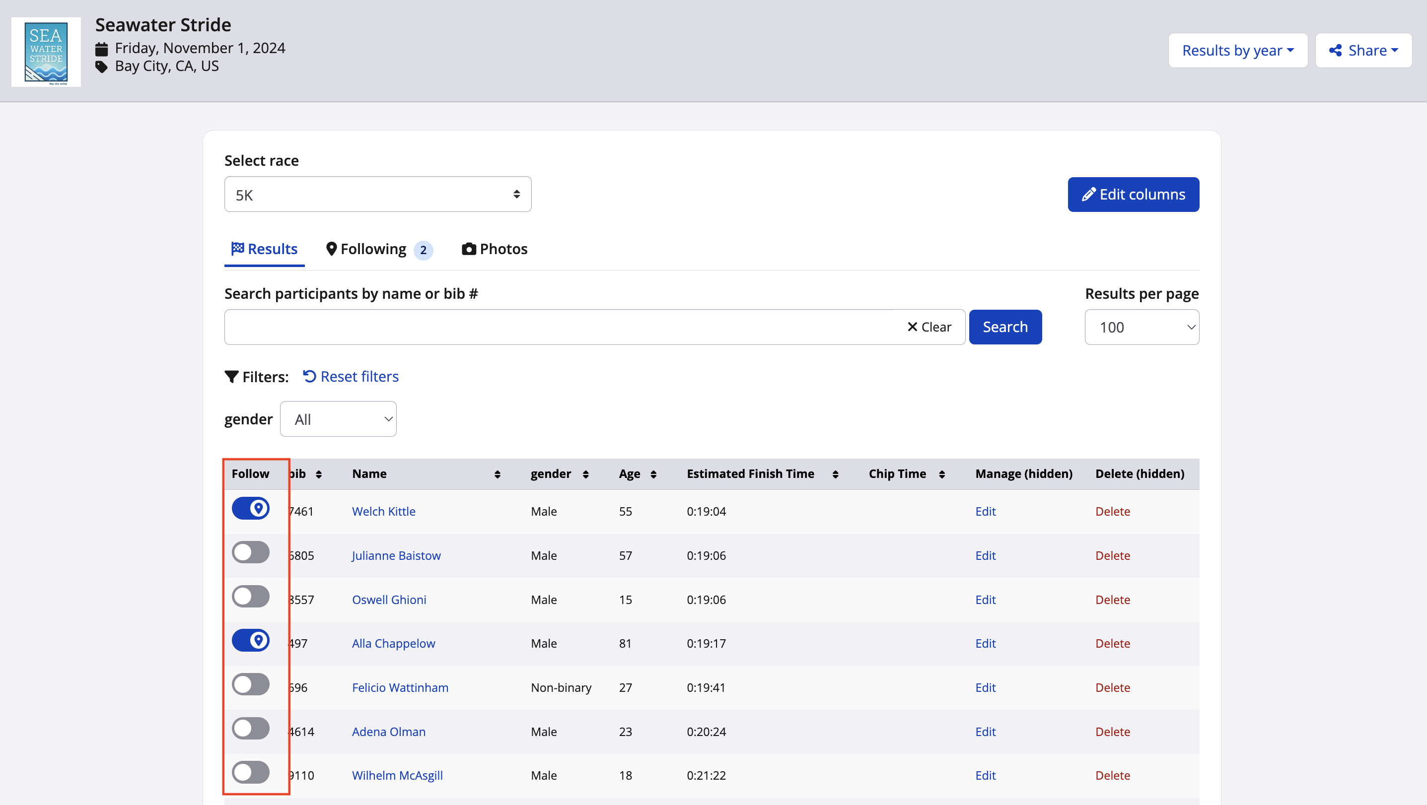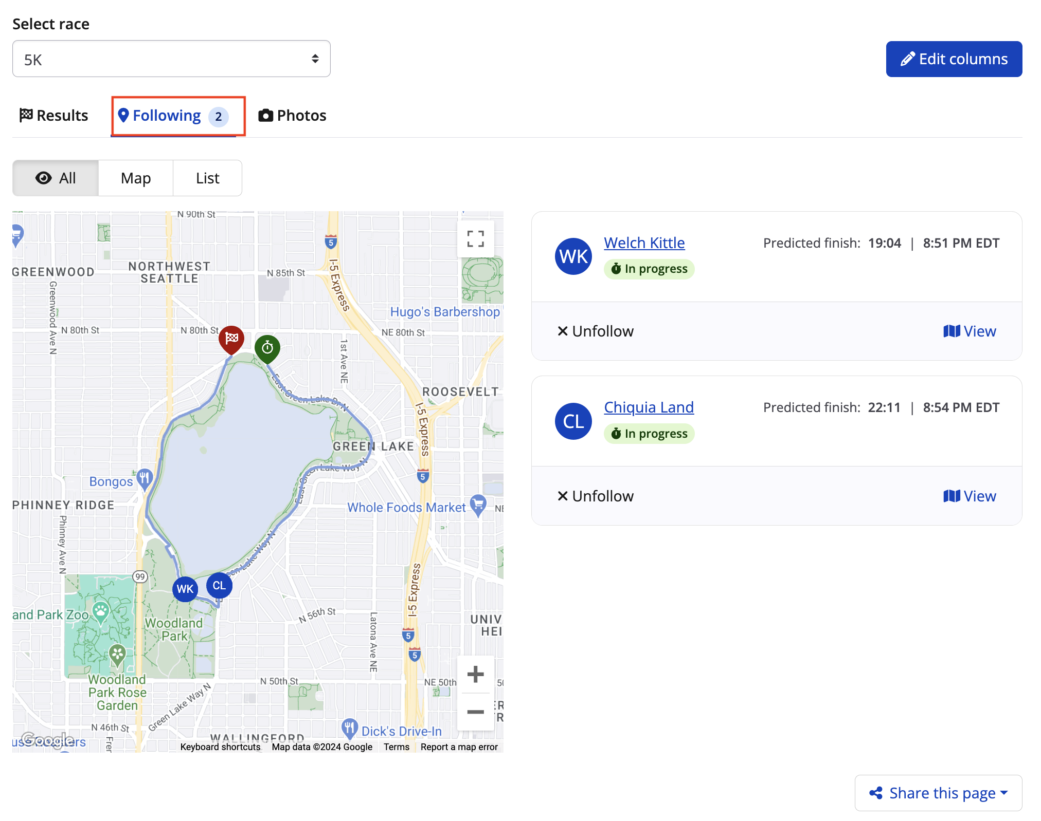 8. After uploading your results, head to your results page and select your desired runners from the results set from the following tab. Any runners selected to follow will appear on the tracking page, allowing you to view the predicted placement of each runner on the race route.